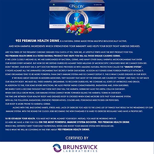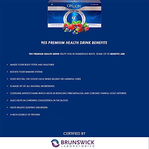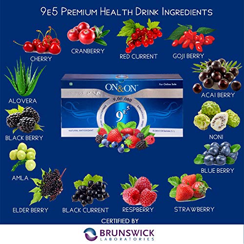 9E5 is a food product and not a medicine. Having said that, antioxidants are helpful to manage oxidative stress and the benefits are broad-spectrum and vary from person to person.CHERRY: Contains low calories yet rich in nutrients, vitamins, and minerals. Cherry contains Anthocyanins which reduce chronic painful gout arthritis, fibromyalgia (painful muscle condition), and sports injuries. Cherries are rich in Melatonin  a powerful anti-oxidant that can cross the blood-brain barrier easily and produce soothing effects on the brain neurons, calming down nervous system irritability which helps relieve neurosis, insomnia, and headache conditions.CRANBERRY: An excellent source of Vitamin C. Its infection-fighting properties help in Asthma & Urinary Tract Infection. It reduces ulcers and prevents peptic Ulcers.RED CURRANT: Low in fat and calories, Rich in Fiber, Vitamin C, Potassium, & Magnesium, Red Currants help digestion, regulate bowel movements, and treats constipation. It helps regulate blood pressure and improves muscle cramps, weakness, and irregular heartbeat.ELDERBERRY: Packed with strong anti-viral properties, Elderberries help fight flu & cold, reduces phlegm, strengthens the upper respiratory system & reduces inflammation. Elder Berries are useful in curing Mouth Ulcers, Tonsilitis, and Sore Throats.GOJI BERRY : Also known as Wolf Berry, the medicinal benefits of Goji Berry is unlimited. It is especially used in the treatment of Diabetes and improves the eyesight and the functioning of the brain. Goji Berries are an excellent source of immune system booster and help relieve sleep disorders.ACAI BERRY: Averys strong source of anthocyanins, Acai berry strengthens the functioning of the heart. It is also a rich source of protein and dietary fiber and Omega 6 & Omega 9 fatty acids that help in lowering the cholesterol in the blood.ON & ON 9e5 Premium health drink contains Pro-Anthocyanins & several other Biologically active substances that improve our bodys immune system and offer protection against various lifestyle-related disorders.