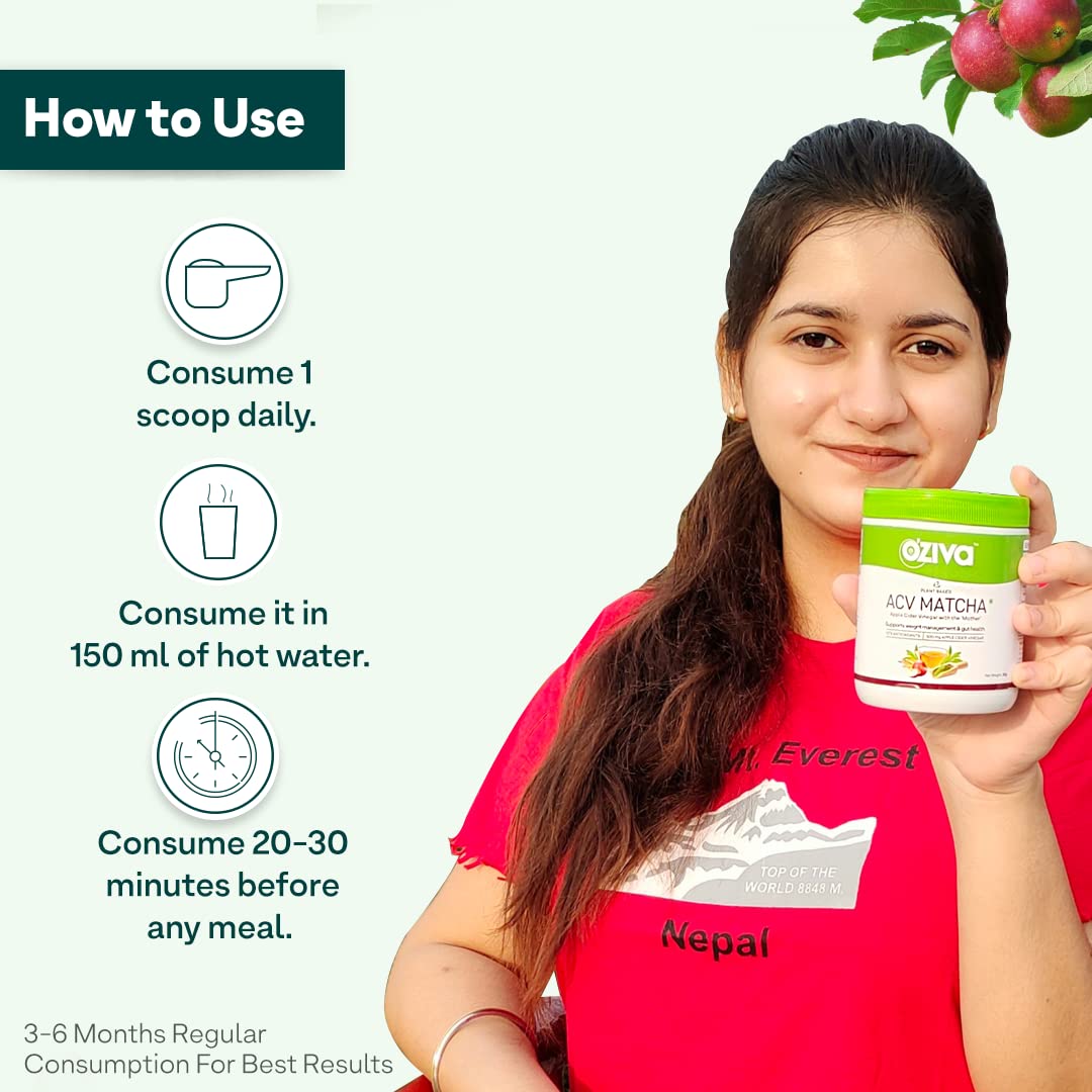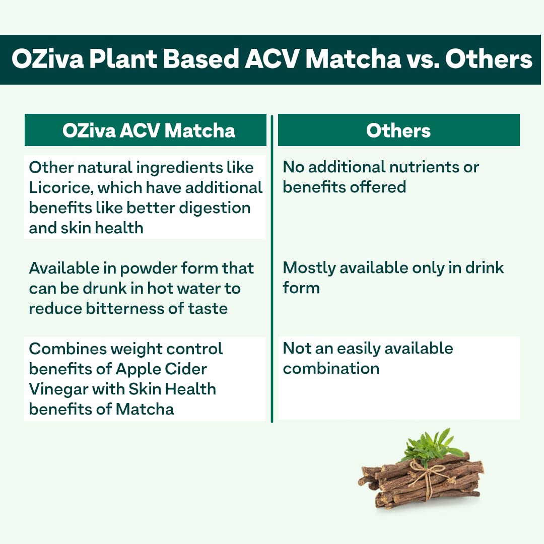 • Apple Cider Vinegar for Weight Control: OZiva Plant Based ACV Matcha has the ‘mother’. ACV is extremely beneficial in management of healthy weight. It delays the rate of absorption of glucose by the intestine (slows gastric emptying) and thus controll