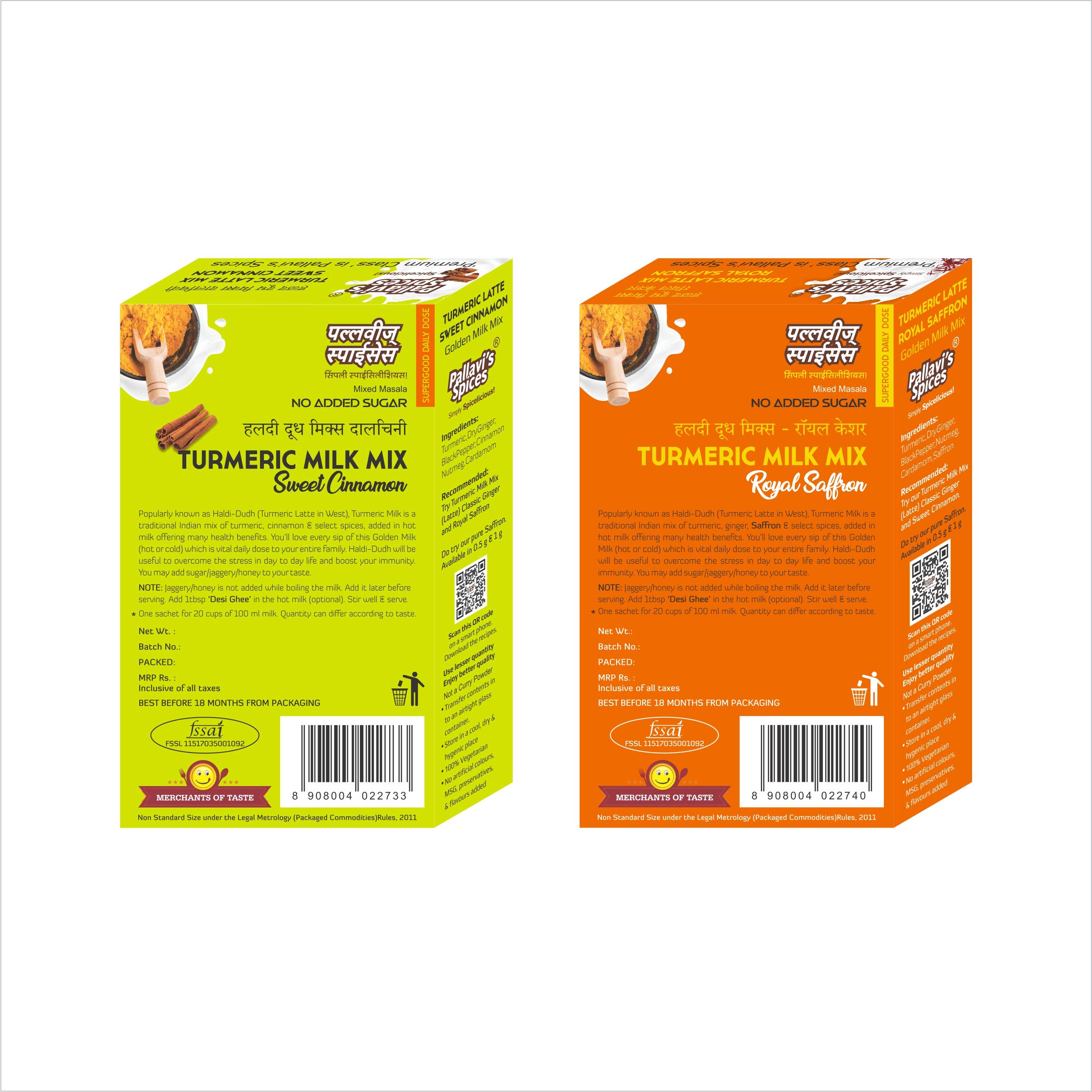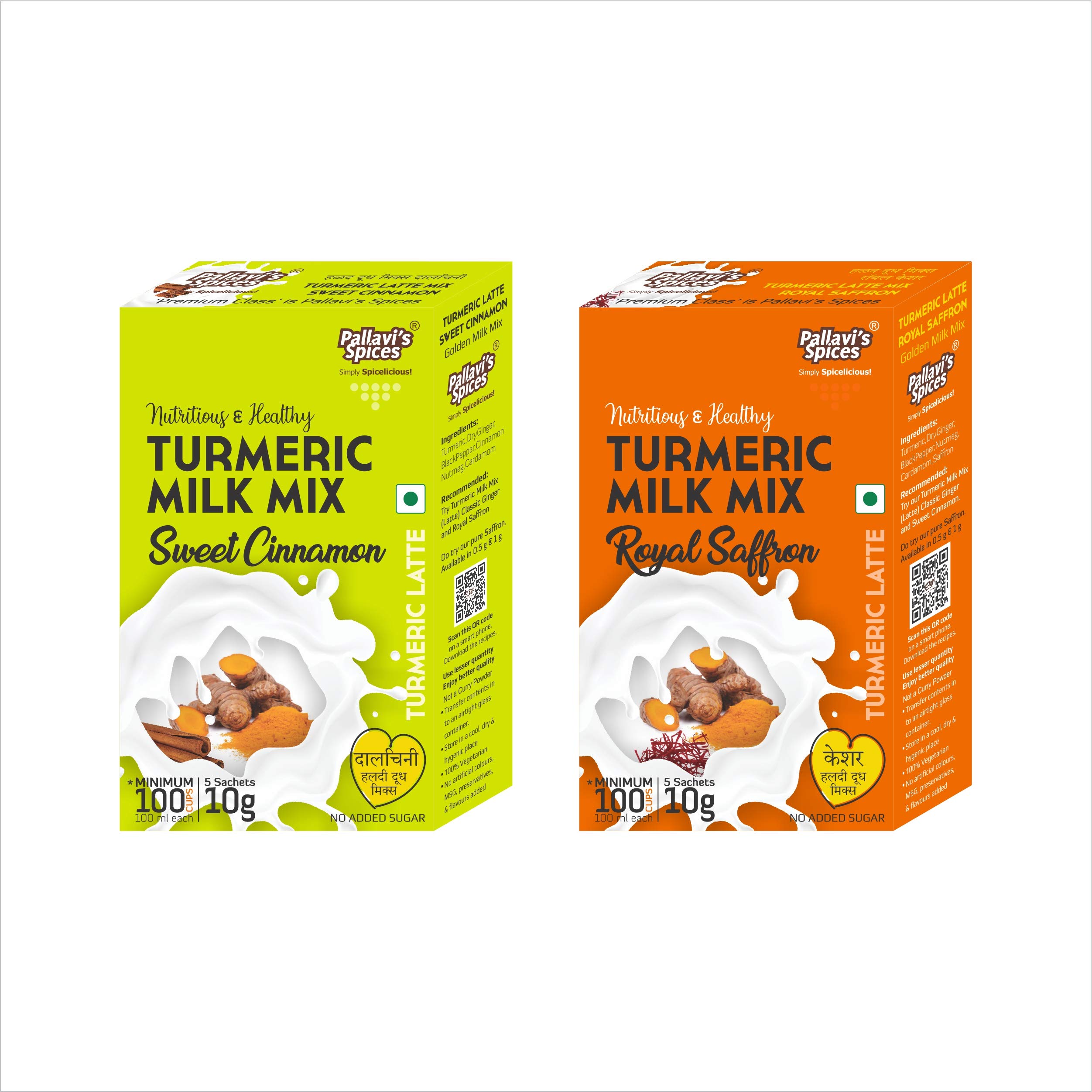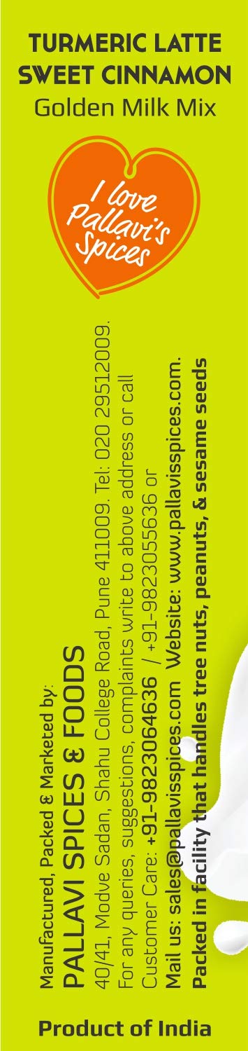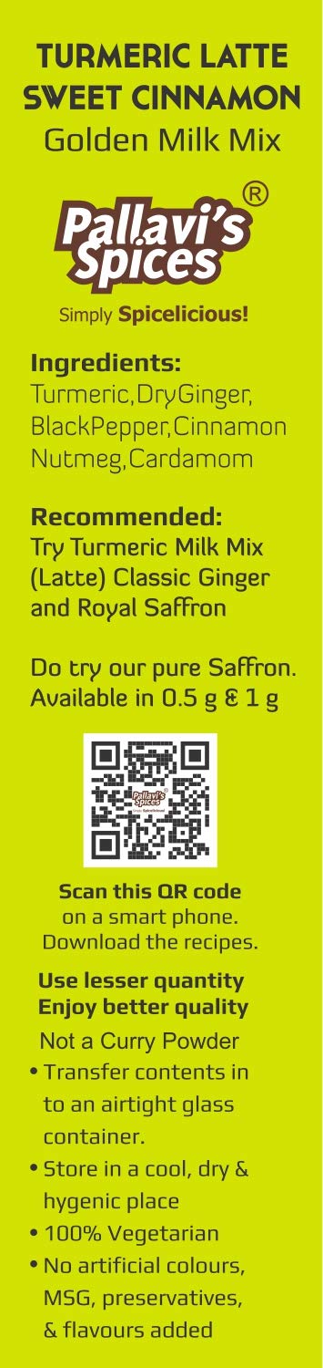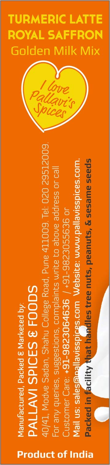 Pallavi's Spices Turmeric Milk Mixes has 1 Royal Saffron and 1 Sweet Cinnamon pack of 50g. One 50g pack each contains 5 sachets of 10g. One sachet is good for 20 cups of 100 ml milk. Quantity can differ according to taste. Popularly known as Haldi-Dudh (Turmeric Latte in West) this is a traditional Indian mix of turmeric ginger Saffron/Cinnamon & select spices added in hot milk offering many health benefits. Golden Milk (hot or cold) is a Supergood Daily Dose to your entire family and doesn't contain Sugar. Haldi-Dudh will be useful to overcome the stress in day to day life and boost your immunity. You may add sugar/jaggery/honey to your taste. Turmeric is well known for its anti oxidant and anti inflammatory properties. Add 1tbsp ‘Desi Ghee’ in the hot milk (optional). Stir well & serve. Note: Jaggery/honey is not added while boiling the milk. Add it later before serving.