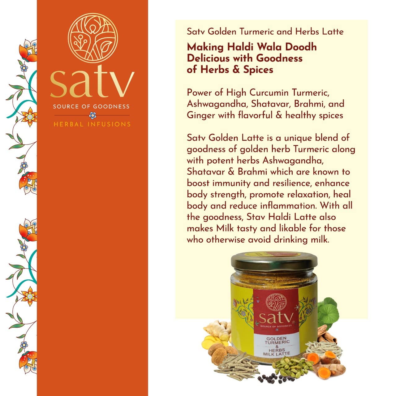 • Flavorful Satv Golden Turmeric & Herbs Milk Latte is a unique combination of the golden herb Turmeric with 8 potent herbs & spices such as Shatavar & Brahmi to boost Immunity of your family. It is a tasty and healthy product enriched with Nutmeg Licorice