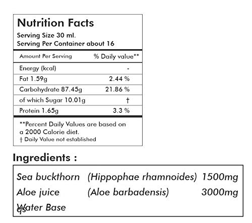 This health juice is a combination of Sea Buckthorn and Aloe Vera. Sea Buckthorn is a rich source of vitamins minerals and various beneficial plant compounds. It is full of antioxidants which helps to fight with oxidative stress and also helps in skin health improvement. It is also considered to have flavonoids which is helpful in reducing the risk of cardiac problems. It is suggested to be a great consumer if you have an issue of high blood sugar. Plant flavonoids are also play an important part in improving the immunity with its illness fighting power. Sea Buckthorn juice is beneficial in improving digestive health and thus helps in keeping your health on the point. Additionally it helps in eliminating the toxins from the body. On the other hand Aloe vera is also rich in nutrients and most popular for its nourishing property. It helps in improving the skin & hair care.