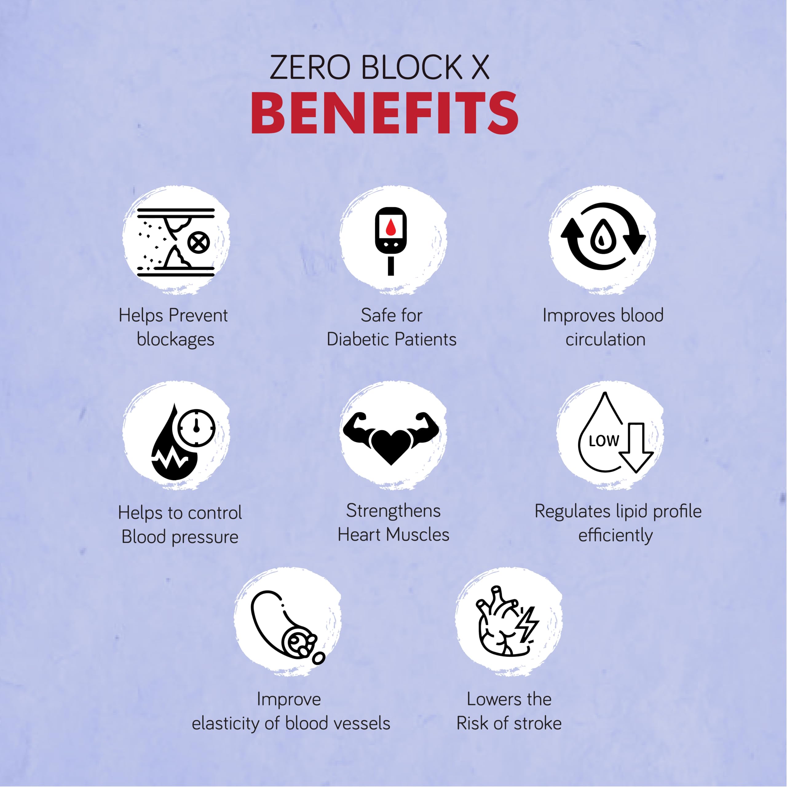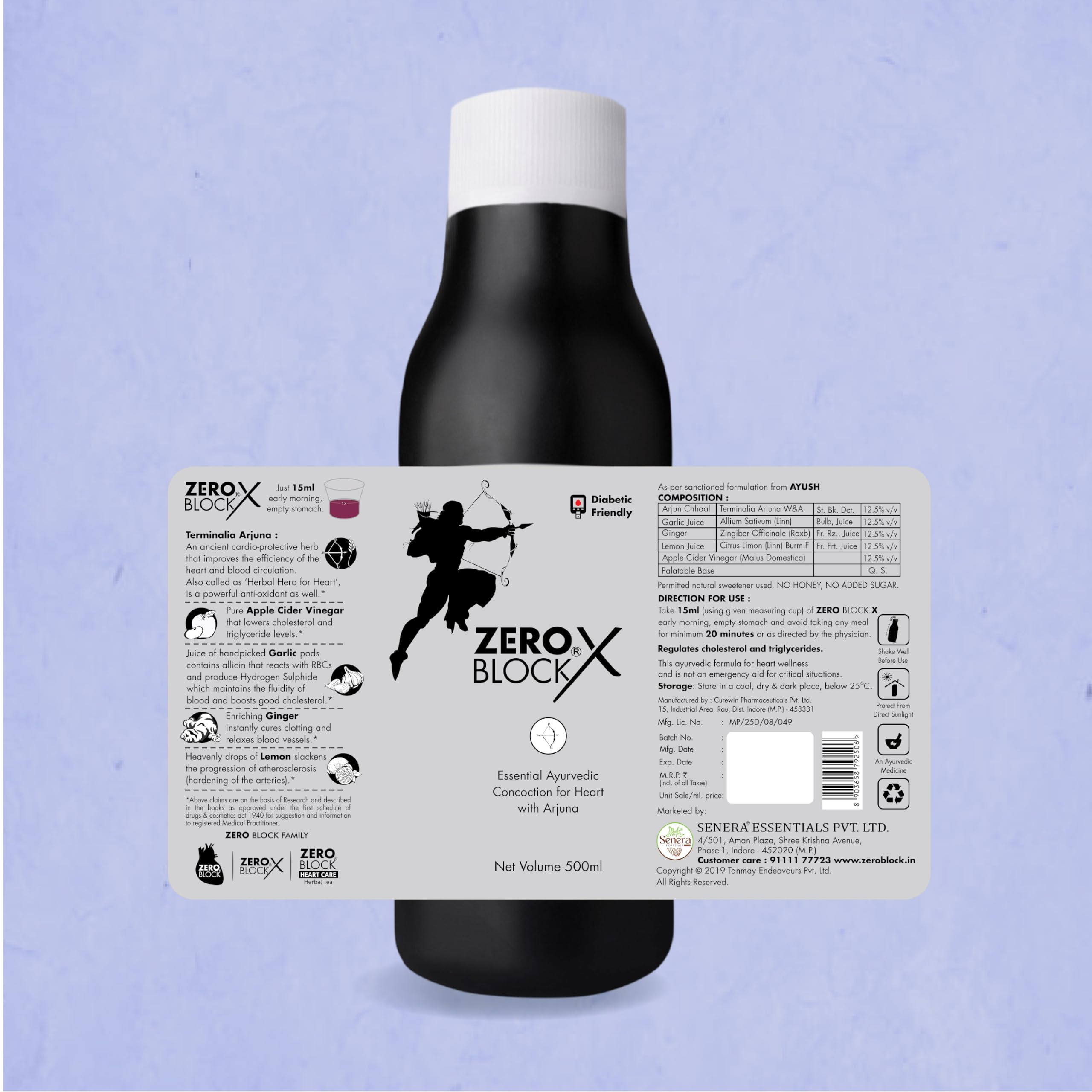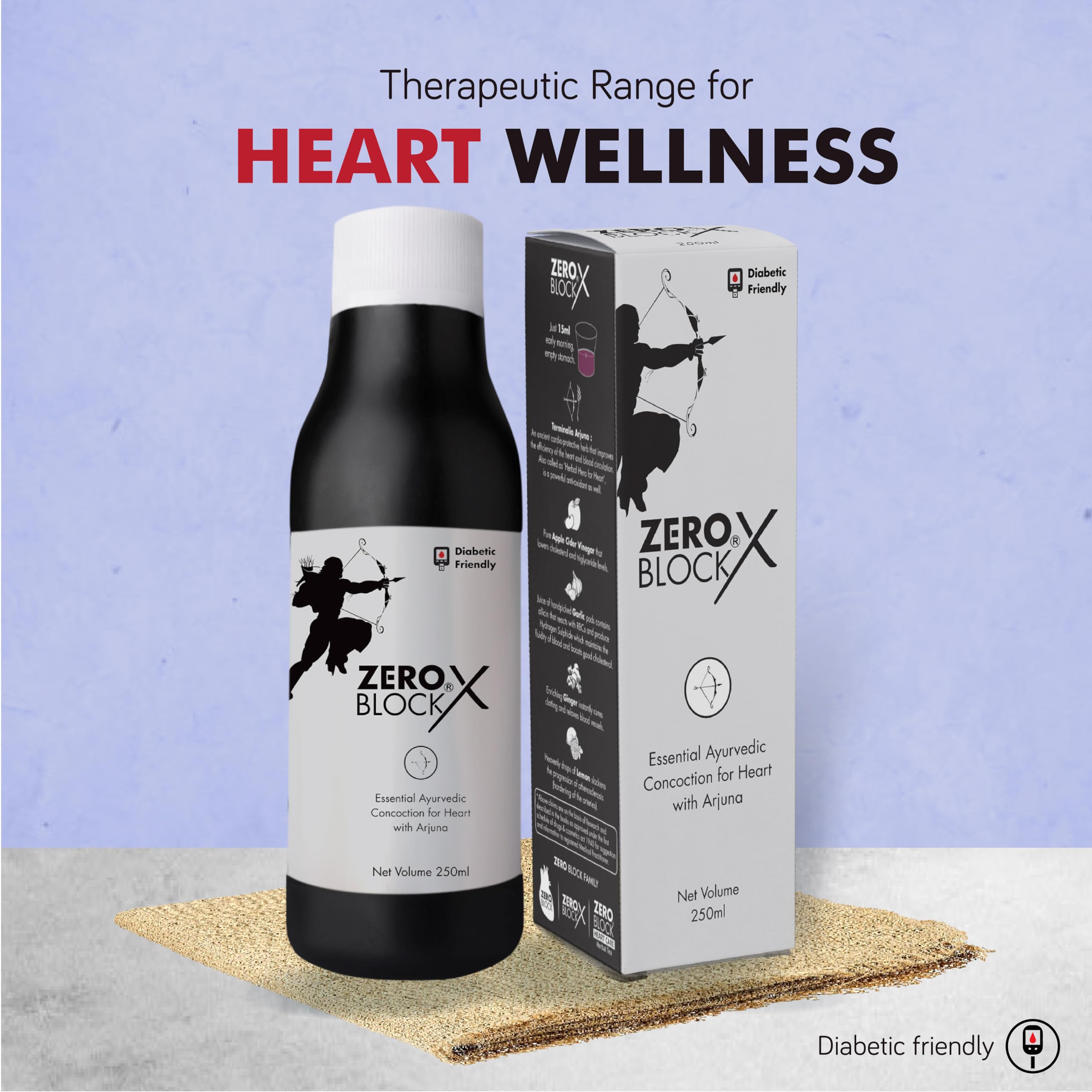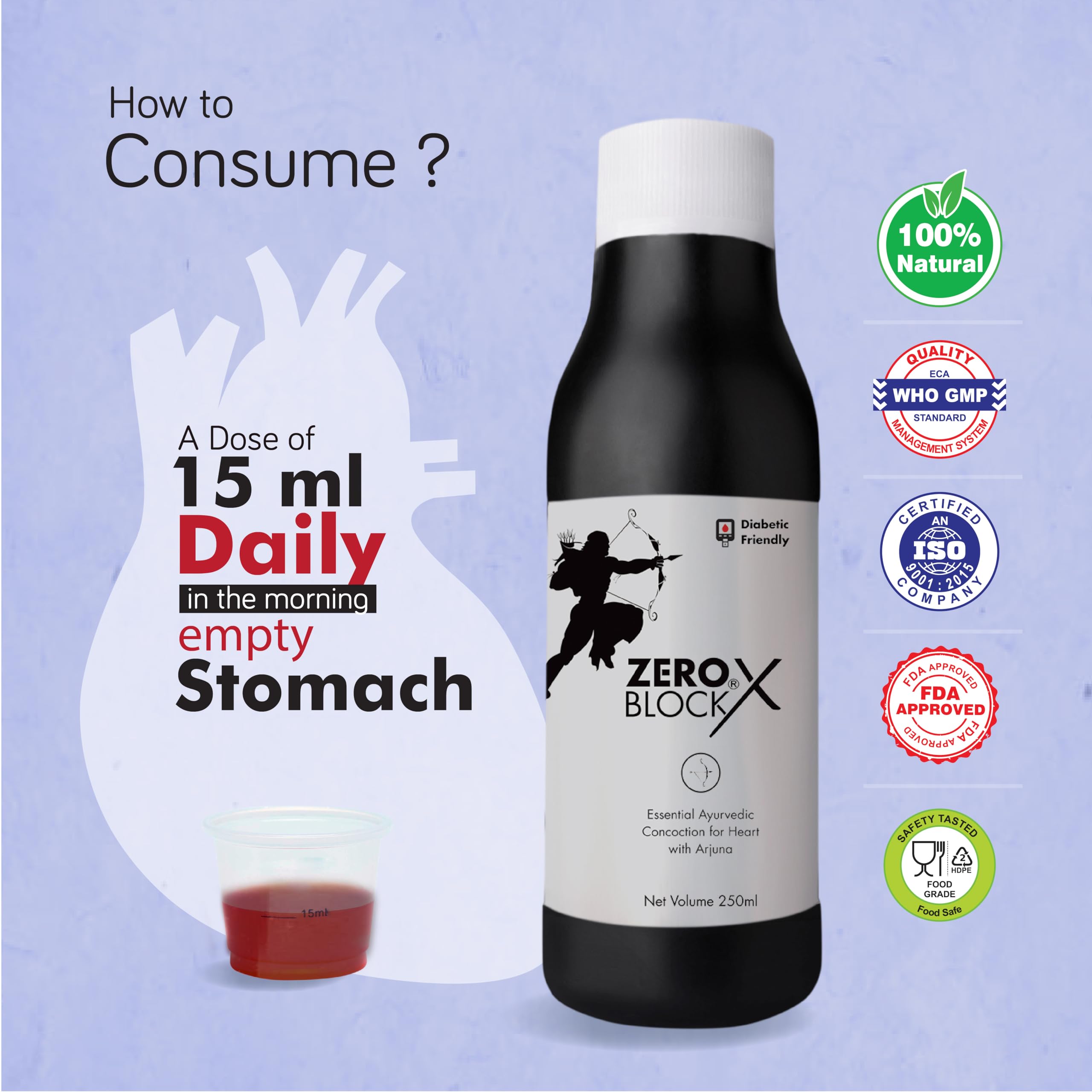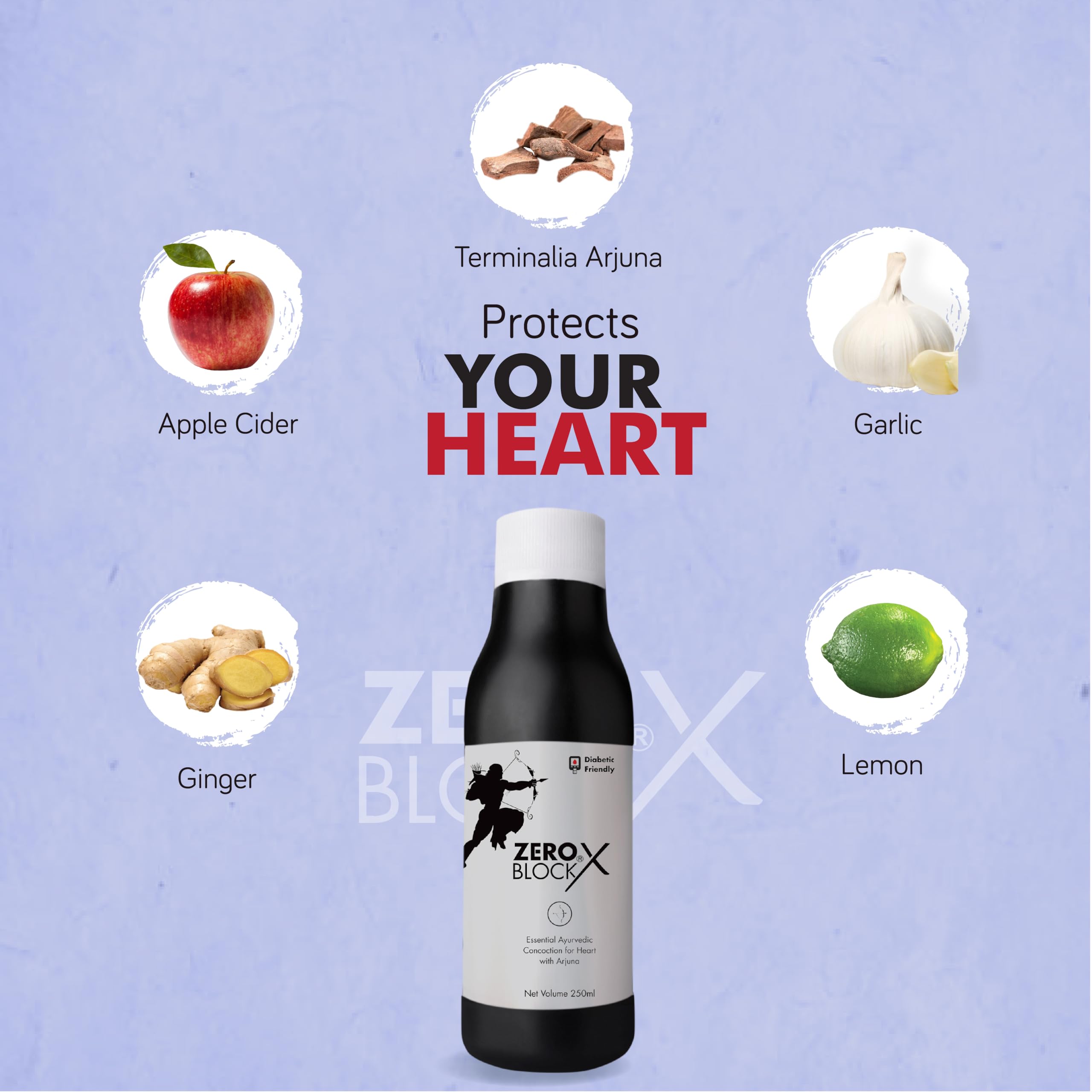 ZERO BLOCK X is an ayurvedic concoction that can help in maintaining heart health. It is a unique blend of natural ingredients like Apple cider vinegar Garlic extracts Ginger extracts Lemon Extracts and Arjuna. ZERO BLOCK X is a diabetic-friendly combination for heart wellness which is to be taken 15ml every morning empty stomach. It is not only an essential heat-tonic for those who have already gone through surgeries or procedures but also it a harmless preventive measure for every age group to stay healthy active and heart-strong amidst the modern-day problems. The juice of handpicked garlics has allicin that reacts with red blood cells and produces hydrogen sulphide which is helpful in maintaining the fluidity of blood and boosting good cholesterol. Lemon helps in slowing down the progression of atherosclerosis which is the hardening of arteries. Apple cider vinegar helps in lowering cholesterol and triglyceride levels and ginger has enriching properties and can relax blood vessels. Zero Block X is a diabetic friendly heart drink that contains the herb arjuna which can boost overall health and well-being. Arjuna is an ayurvedic ingredient that can help boost heart functions and strengthen the muscles of the heart. The herb possesses strong anti-inflammatory and antioxidant properties that can protect the heart muscles and blood vessels against damage caused by free radicals.