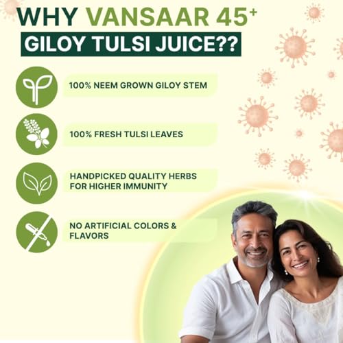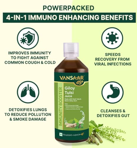 Vansaar 45+ Giloy Tulsi Juice contains two super-ingredients â Neem grown Giloy & Fresh Tulsi which are handpicked to provide you with the top quality Natural Immunity Booosters to support your immune system. The 4-in-1 Immuno-enhancing benefits helps improve immunity levels detoxifies lungs to prevent against the ill-effects of pollution & smoke speeds up recovery from infections and cleanses your gut to build stronger immunity from within.