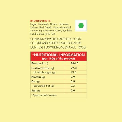 Falooda is an Indian beverage that is served cold with Ice cream on top. This is a rose flavoured falooda mix and is a refreshing thick drink with many ingredients for a hot / warm day. Single pack of 200g serves 6