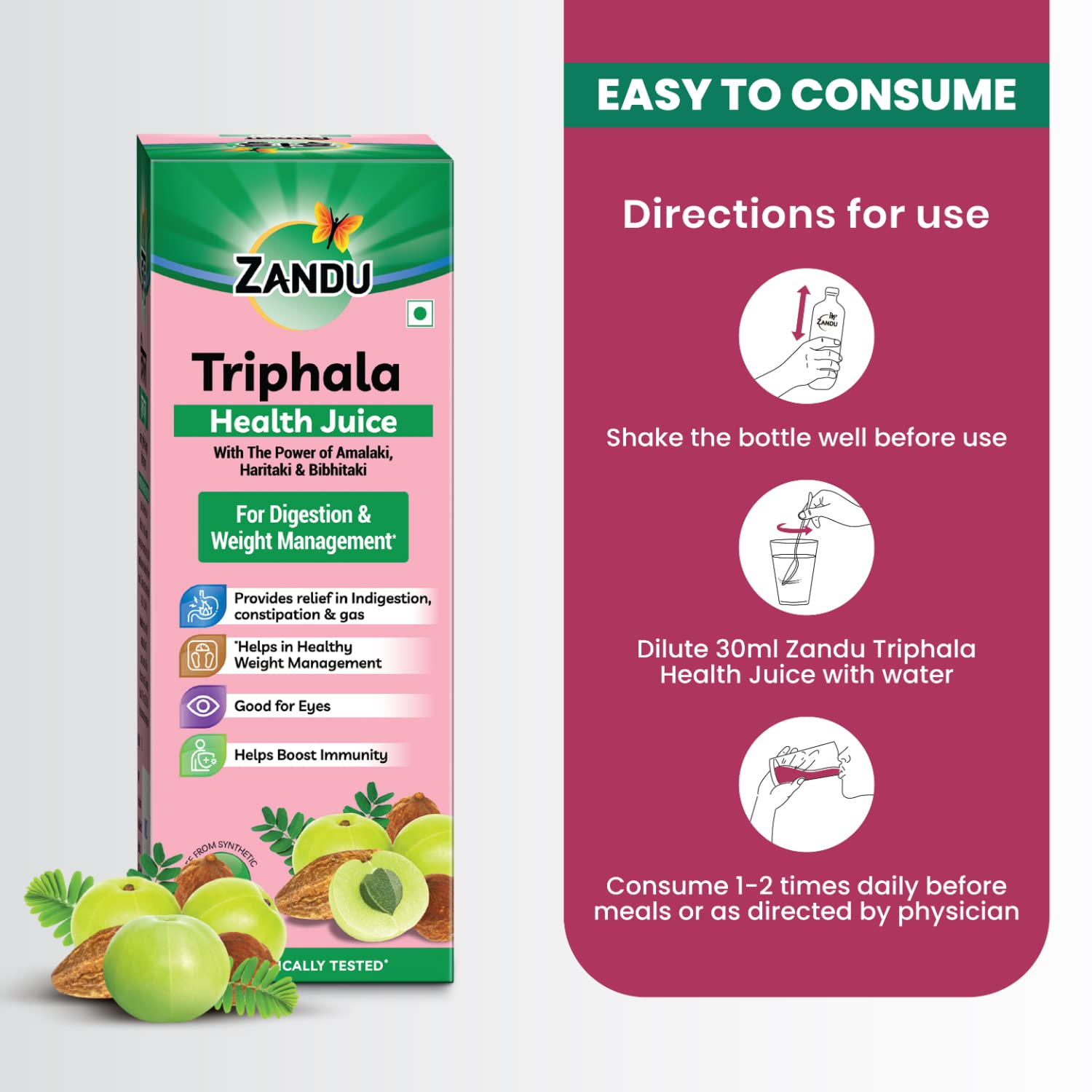 Zandu Triphala Health Juice is an Ayurvedic Health Juice. Triphala constitutes the goodness of three fruits - Amla Haritaki & Bibhitaki. Zandu Triphala Health Juice is made with Zandu's more than 100 years of Ayurvedic research & expertise. It is Scientifically tested. It helps provide relief in indigestion constipation & gas. Helps in healthy weight management. Is good for eyes as well as Helps boost immunity. It is free from synthetic colours & flavours has no added sugar