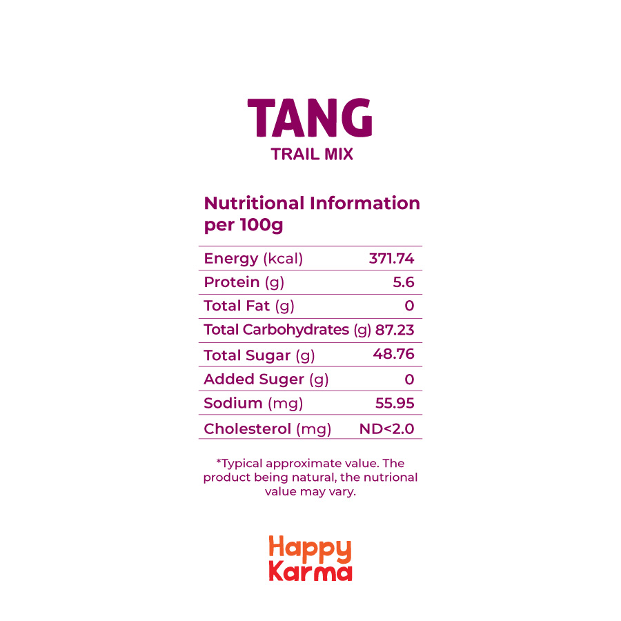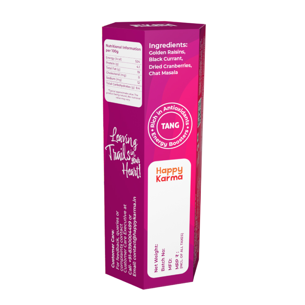 Happy Karma Tang Trail Mix is a tasty and unique blend of natural ingredients that delivers a flavorful and savory snacking experience. This 30g pack of trail mix features a mix of golden raisins, dried cranberries, and black currants, which provide a chewy texture and a sweet-tart flavor. The fruits are coated with sunflower oil and coconut sugar to add a subtle sweetness and nutty flavor. In addition to the traditional rock salt seasoning, this trail mix is also seasoned with chat masala, a classic Indian spice blend consisting of cumin, coriander, dried mango powder, and other aromatic spices. The chat masala adds a tangy and savory flavor to the mix, providing a unique taste sensation that will keep you coming back for more. This snack is perfect for those who enjoy bold and exotic flavors, and is a great source of energy for any time of day.