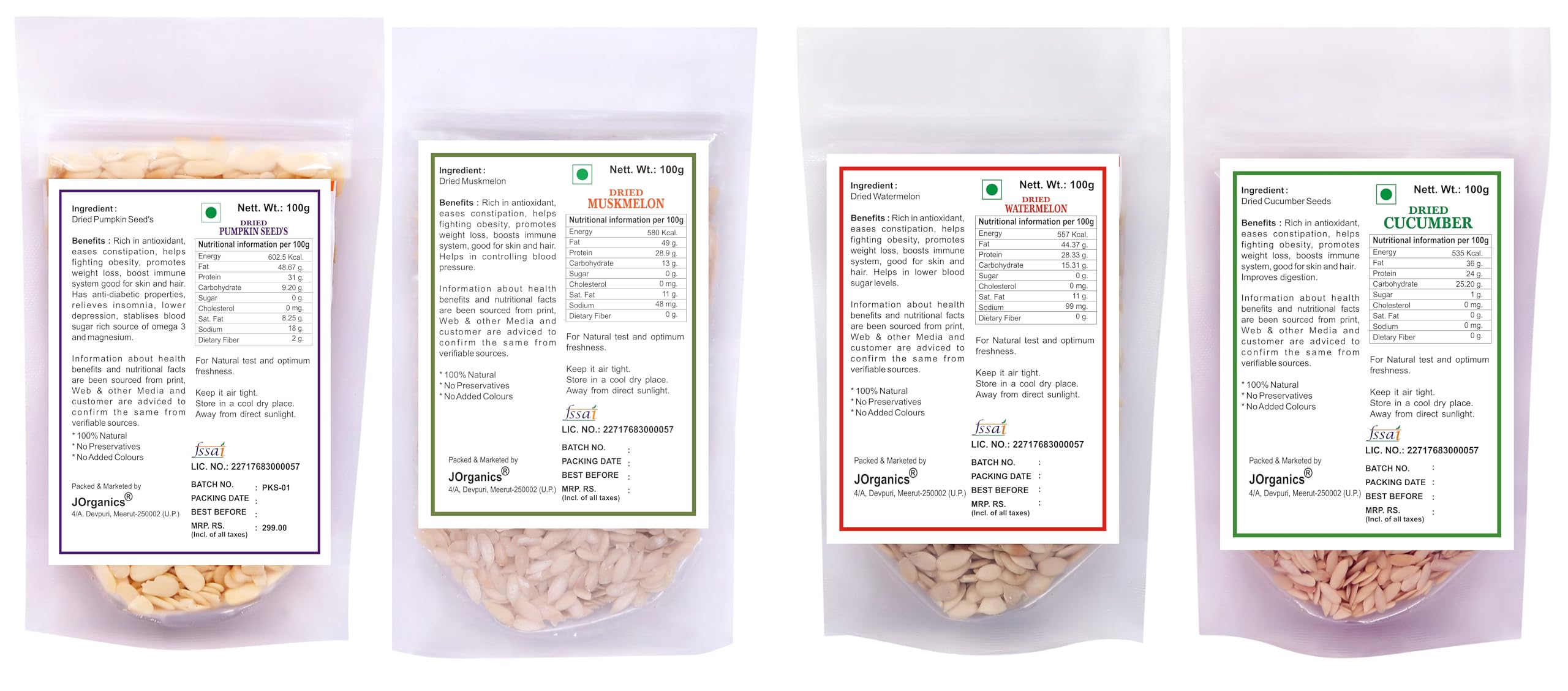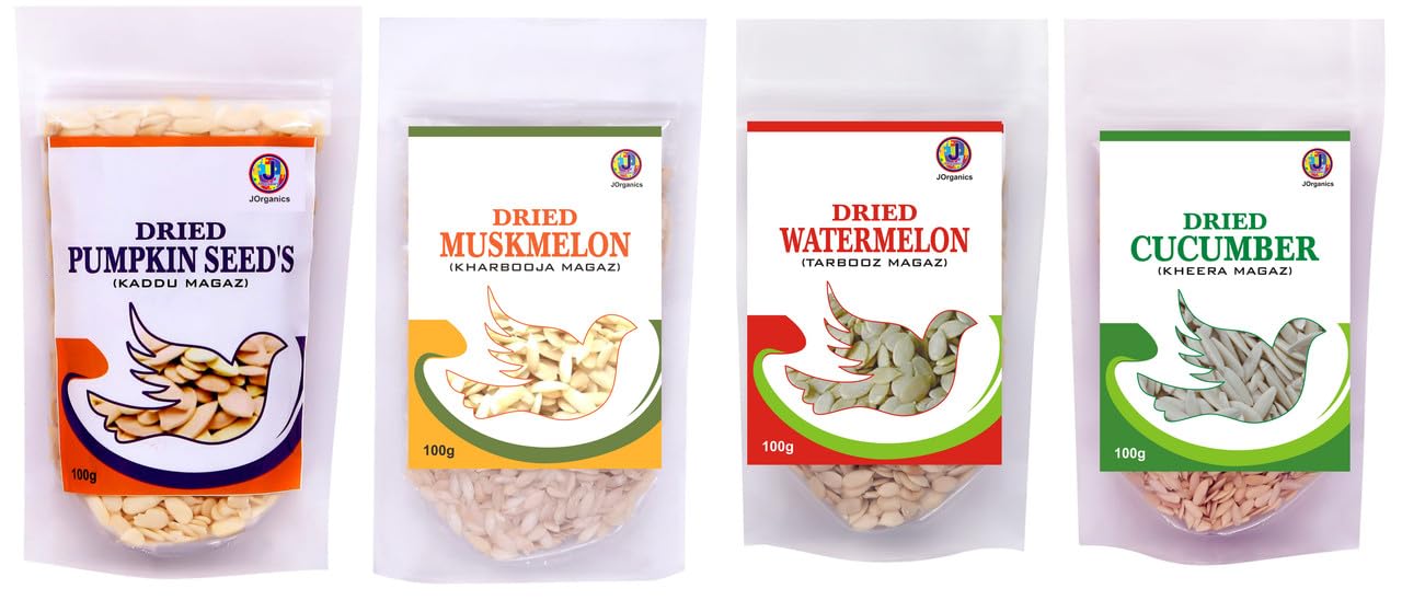 JOrganics Combo Pack: 100g Each of Char Magaz Cucumber Pumpkin Watermelon & Muskmelon Seeds - Premium Edible Seeds Pack of 4