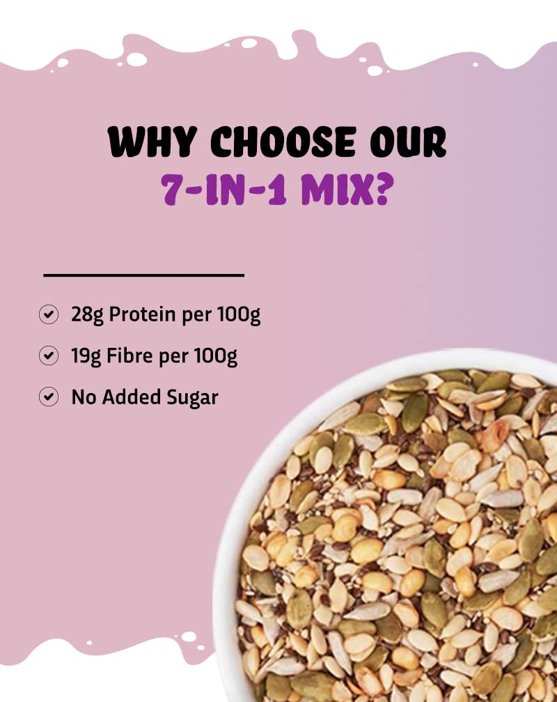 Protein Rich : Our seed mix is packed with 7 super-seeds including nuts such as soynuts all of which are highly rich in plant-based protein consisting of about 24g of protein per 100g.