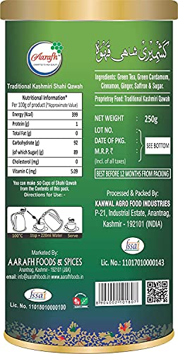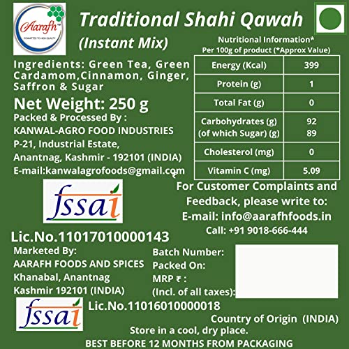 A traditional green tea spiced with saffron Green Cardamom Ginger Cinnamon and other herbs. National Masala Mills (Regd.) is one of the oldest manufacturers of traditional Kashmiri Spices and food products in the valley dealing in the quality food sector and having wide product range from Basic Spices to Gourmet drinks like Shahi Qahwa and the pristine Saffron Spice etc