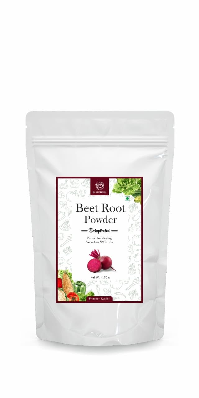 AL MASNOON Beet Root Powder is a vibrant superfood packaged in a convenient 100g bag perfect for enhancing your culinary creations and boosting your health. Made from 100% natural beetroot this nutrient-rich powder offers a delightful way to incorporate the benefits of beets into your diet. Known for its striking color and earthy flavor beetroot powder is an excellent addition to smoothies curries juices and baked goods. Its versatility allows you to add a nutritional boost to various dishes while enjoying the natural sweetness of beets. Rich in vitamins minerals and antioxidants beetroot powder supports cardiovascular health enhances energy levels and aids in digestion. It's also known for its ability to improve athletic performance by increasing blood flow and oxygen delivery to muscles. Easy to use simply mix AL MASNOON Beet Root Powder into your favorite recipes or beverages for a nutritious and flavorful enhancement. Embrace the health benefits and culinary versatility of this superfood making it a staple in your kitchen for both vibrant meals and wellness.