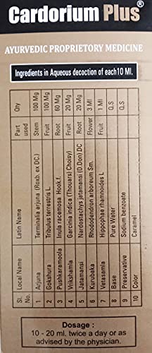 Cardorium Plus Syrup that is an effective herbal remedy. **Note** Cardorium Plus is a herbal decoction there is a likely to be minor color viscosity and taste variation from batch to batch because of seasonal variations of raw materials. Color and taste change will not affect the efficacy of the Product. Shake Well before use. Store the product in a cool and dry place. Consume the product within 30 days after opening the container. **Disclaimer** Avoid self-medication One should use these products under Ayurvedic Practitioner consultation.