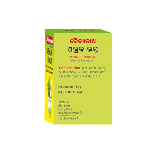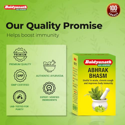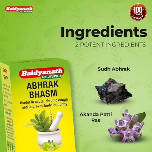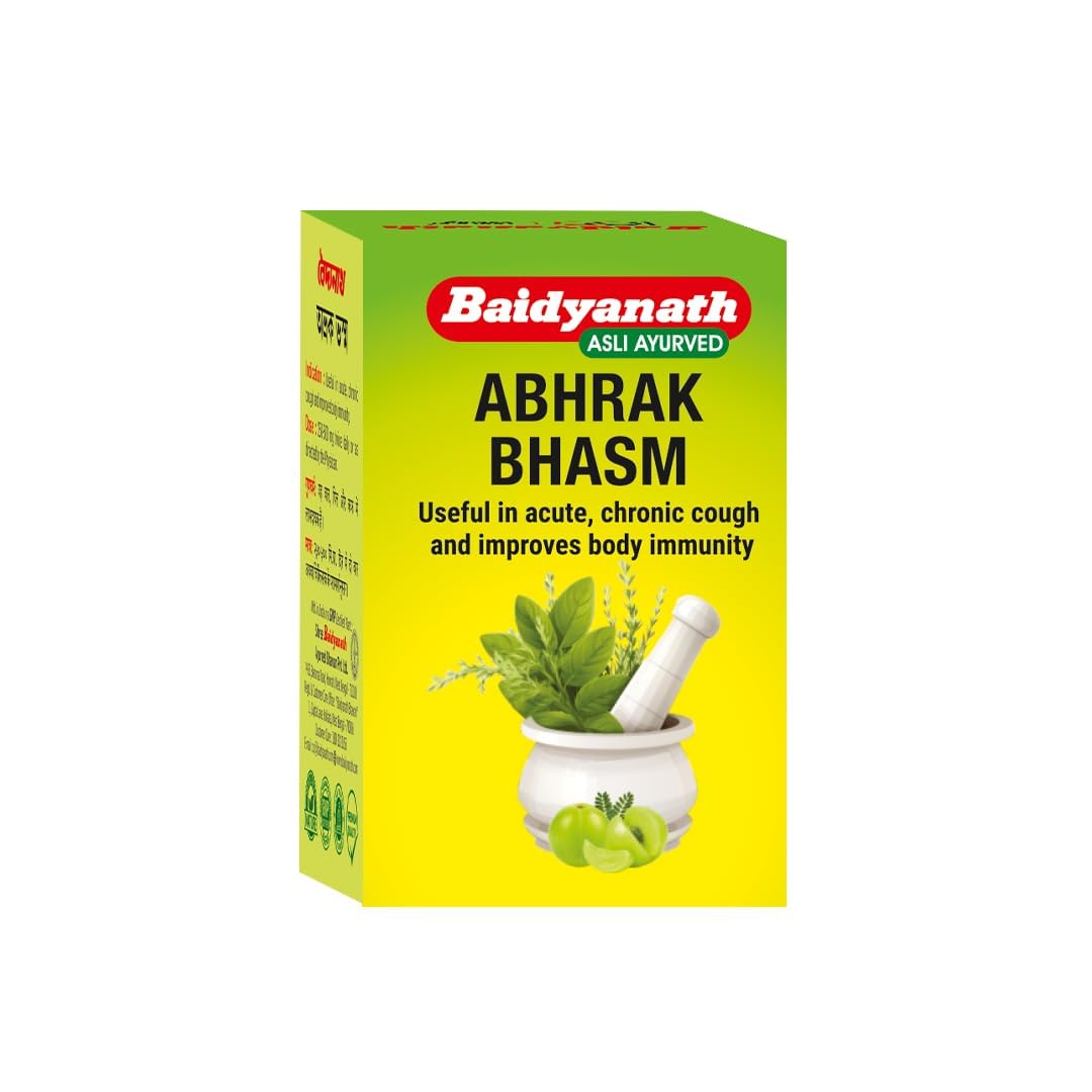 Abhrak bhasma is an Ayurvedic medicine for cold and cough and also helps combat gastric issues. This product is manufactured by Shree Baidyanath Ayurved Bhawan Pvt. Ltd. Consume 250-500mg twice a day or as directed by Ayurvedic practitioner.