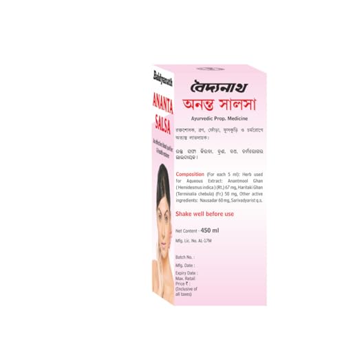 Baidyanath Ananta Salsa is an Ayurvedic formulation of Anantamool and other ayurvedic ingredients which help combat skincare problems by cleansing internally. This formulation helps fight acne itchiness and hairfall troubles. Mix 2 to 4 teaspoonfuls of this syrup with equal quantities of water and consume is twice a day or as directed by an Ayurvedic practitioner.