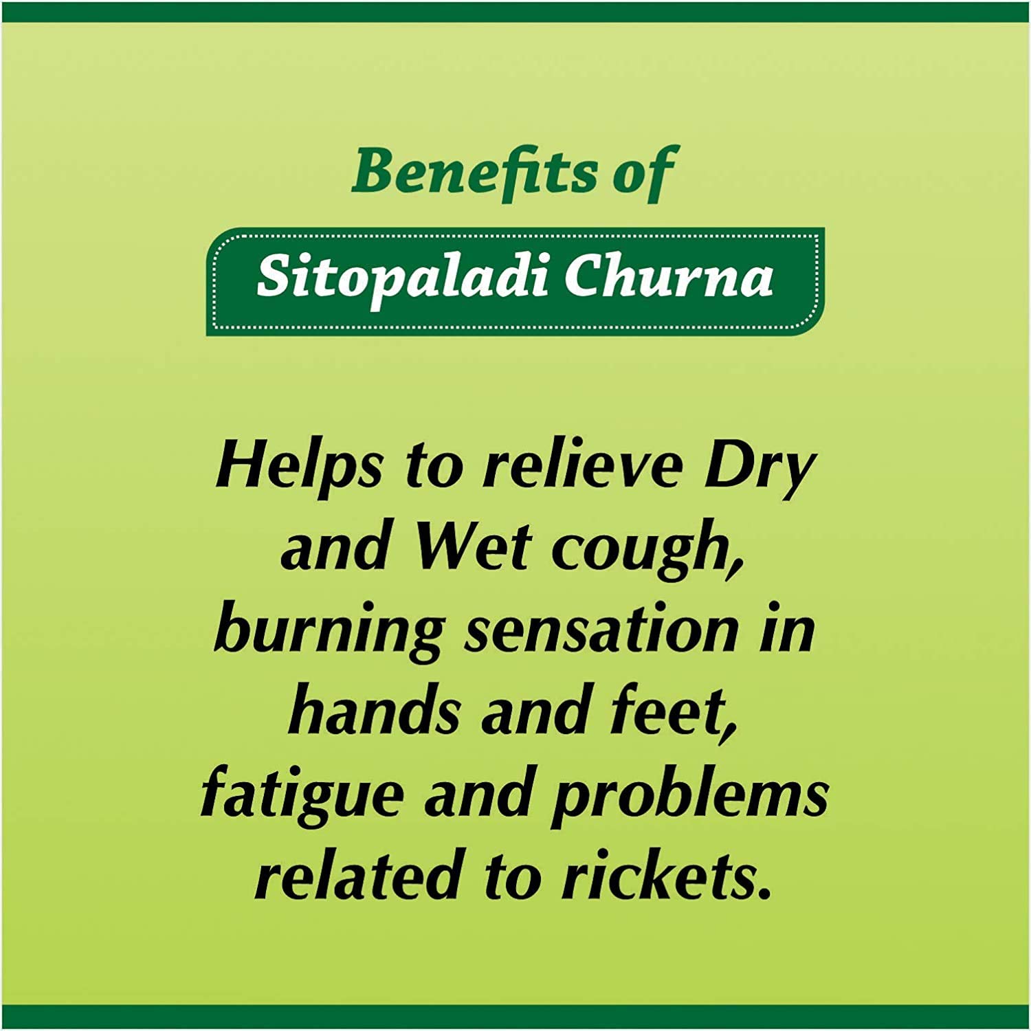 Helps to relieve dry and wet cough burning sensation in hands and feet fatigue and problems related to rickets. Dosage: 1/2 to 1 teaspoonful twice a day with honey or as advised by the physician.