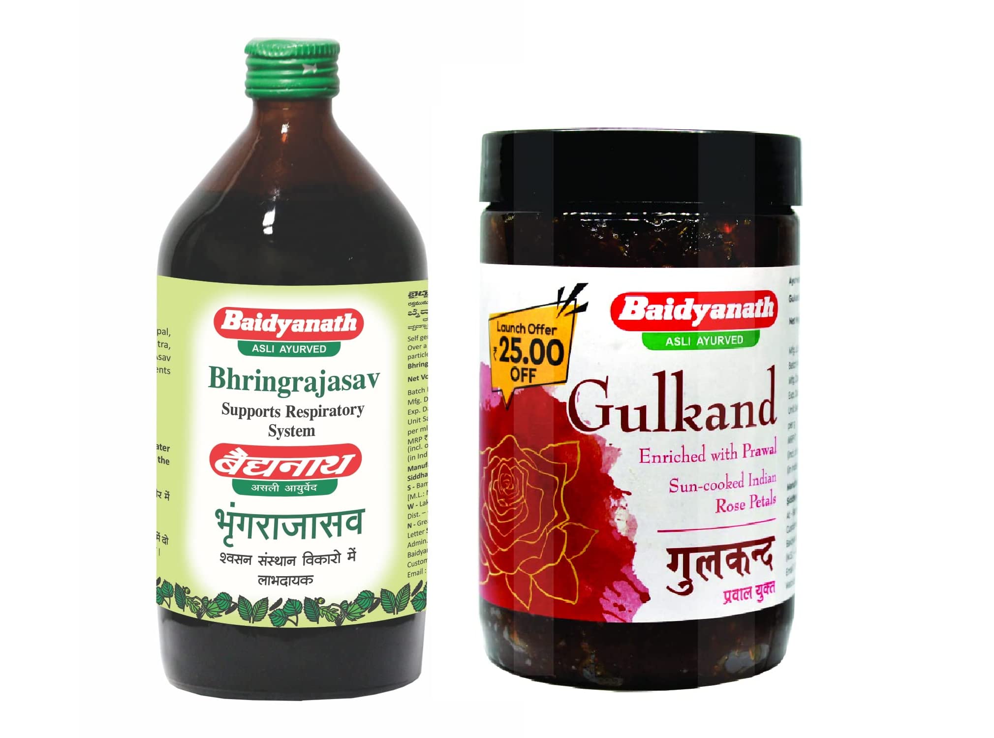 Baidyanath Bhringrajasava Syrup 450 ml | Gulkand - 400gram - (Pack Of 2) - 100% Natural | Sun Dried | Bhringrajasava For Hair