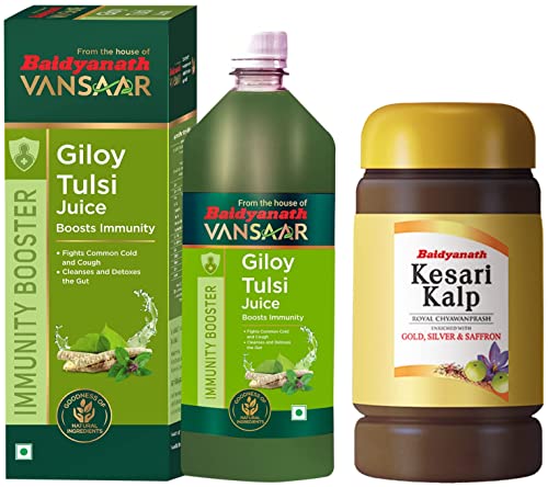 Baidyanath Giloy Tulsi Juice - Helps Boost Immunity - 1LBaidyanath Giloy Tulsi Juice is extracted from fresh Tulsi leaves and Giloy stems. These two herbs individually have great health benefits and together they become more effective in boosting your immunity levels. Tulsi and Giloy are popular and useful Ayurvedic herbs. They have been used in ancient Ayurvedic medicines to treat respiratory illnesses infections and allergies.Baidyanath Kesari Kalp Royal Chyawanprash - Enriched with Gold Silver and Saffron - 1kgBaidyanath Kesari Kalp Royal Chyawanprash â Anti-ageing tonic for rejuvenation and vitality enriched with Gold Silver & Saffron with 44 herbs and minerals. Baidyanath Kesari Kalp Royal Chyawanprash is an unique research formulae and excellent Ayurvedic tonic formulated with the combination of rare herbs rich spices and fruits by renowned Ayurvedic Scholars & Baidyanath Research Foundation. The materials are very carefully chosen to impart right benefits that rejuvenate the body and bring back youthful energy and vigor. Kesari Kalp â Royal Chyawanprash is an excellent remedy to relieve symptoms of premature ageing weight loss disability vitamin & mineral deficiency & convalescence. These ingredients give the body the much-needed power to cope up with todayâs hectic life. Baidyanath Kesari Kalp â Royal Chyawanprash is the answer to the need of people over 40 years of age for keeping the body and mind healthy and active. It has anti-ageing properties and its regular use builds immunity. As one gets older the body usually gets tired and working efficiency drops. Baidyanath Kesari Kalp â Royal Chyawanprash helps in faster cell regeneration and works towards elimination of fatigue. It detoxifies the body and builds healthy tissues.