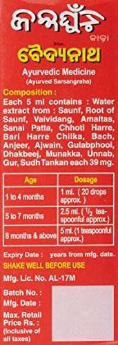Baidyanath Janmghunti tonic is very effective for Infents. It is used in general weakness flatulence constipation and other diseses in .It contains water extract from Saunf Root of Saunf Vaividang Amaltas Sanai Patta Chhoti Harre Bari Harre Chilka Bach Anjeer Ajwain Gulabphool.