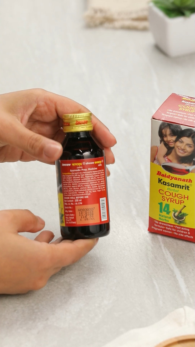 Baidyanath Kasamrit Herbal Cough Syrup acts as an herbal medicine for common cough and cold sneezing running nose nasal congestion and sore throat. It helps relieve itchy scratchy throat and liquifies and expels distressing and irritating cough. Consume 1-2 teaspoons thrice a day or as directed by the physician.