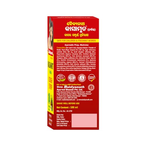 Baidyanath Kasamrit Herbal Cough Syrup acts as an herbal medicine for common cough and cold sneezing running nose nasal congestion and sore throat. It helps relieve itchy scratchy throat and liquifies and expels distressing and irritating cough. Consume 1-2 teaspoons thrice a day or as directed by the physician.