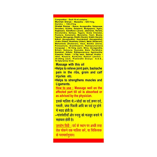 Ingredients are extracts from bel chhal (aegle marmelos) ashwagandha (withania somniferra) bari kateri (solanum indicum) gokhru (tribulus terrestris) sona patha (oroxylum indicum) bala panchang (sida cordiflolia) farhad chhal (paribhadra) (erythrina variegata) chhoti kateri (solanum surattense) punarnava mool (boerhaavia diffusa) ganiyari (clerodendrum plomidis) kanghi (abutilon asiaticum) gandh prasarini (paederia foetida) parul (patla) (stereospermum suaveolens) murchhit til tel (sesamum indicum)dudh shatawri ras or kwath (asparagus racemosa) kalk materials rasna (pluchea lanceolata) ashwagandha (withania somniferra) sounf (foeniculum vulgare) devdaru (cedrus deodara) kuth (saussurea lappa) shalparni (desmodium gangeticum) mugdhparni (phaseolus trilobus) agar (aquilaria agallocha) nagkeshar (mesua ferra) sendha namak jatamansi (nardostachys jatamansi) haldi (curcuma longa) daruhaldi (berberis aristata) chharila (parmelia perlata) safed chandan (santalum album) pushkarmool (pohakar) chhoti elaicihi (elettaria cardamomum) manjith (rubia cordifolia) mulethi (glycurrhiza glabra) tagar (valeriana wallichi) nagarmotha (cyperus rotundus) tejpata (cinnamomum tamala) bhringraj (eclipta alba) jiwak (bidarikand) (puereria tuburosa) risbhak (bidarikand) (puereria tuburosa) kakoli (aswagandha) (withania somnifera) kshir kakoli (aswagandha) (withenia somnifera) meda (satavar) (asperagus racemosus) mahameda (satavar) (asperagus recemosus) ridhi (varahikand) (dioscorea alata) bridhi (varahikand) (dioscorea alata) sugandhabala (khas) (valeriana wallichi) bach (acorus calamus) palasmool (butea monosperma) gathiwan (leonotis nepetaefolia) punarnavamool (boerhaavia diffusa) chorpushpi prakshep materials karpoor (cinnamomum camphor) keshar (crocus sativus) kasturi.