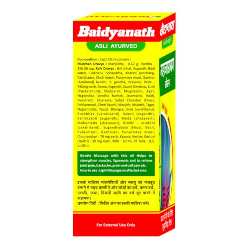 Baidyanath Mahanarayan tail is an Ayurvedic oil widely used for relief from Vata Roga (joint and muscular pains). Enriched with goodness of pure Saffron which is clinically proven to reduce inflammation in joint pain. This property is accepted by modern science also. Daily massage with this oil helps in relieving pain and stiffness of joints and muscles.