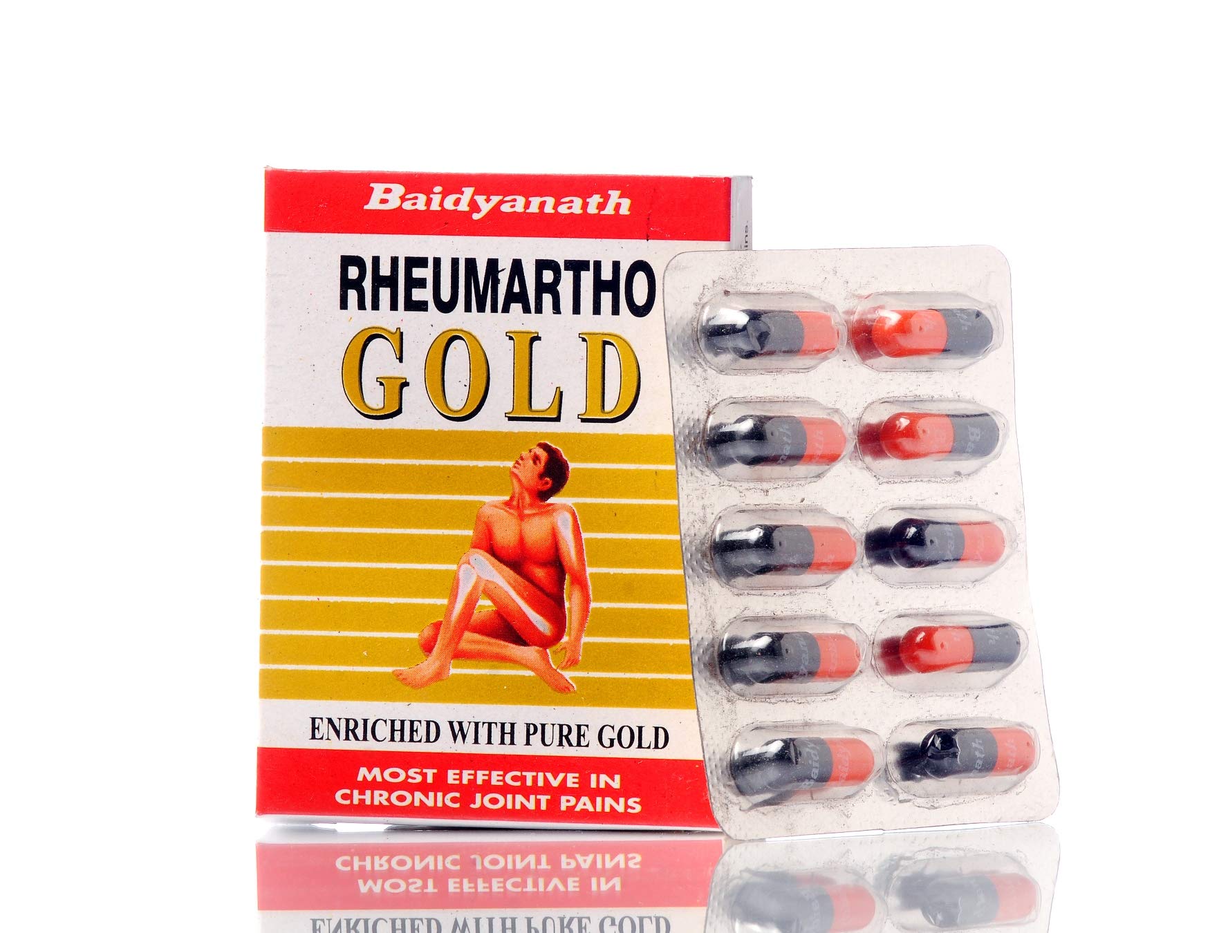 Baidyanath has developed a formula containing Gold. It is indicated in Arthritis.Rheumatism Osteoarthritis. Gold in Rheumartho Gold plus Capsule often arrest the progression of the disease involved joints at least temporally prevent involvement of unaffected joint improve grip strength and decrease the erythrocyte sedimentation rate and abnormal plasma glycoprotein and fibrinogen levels.