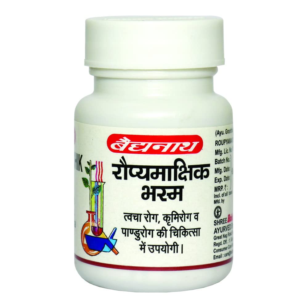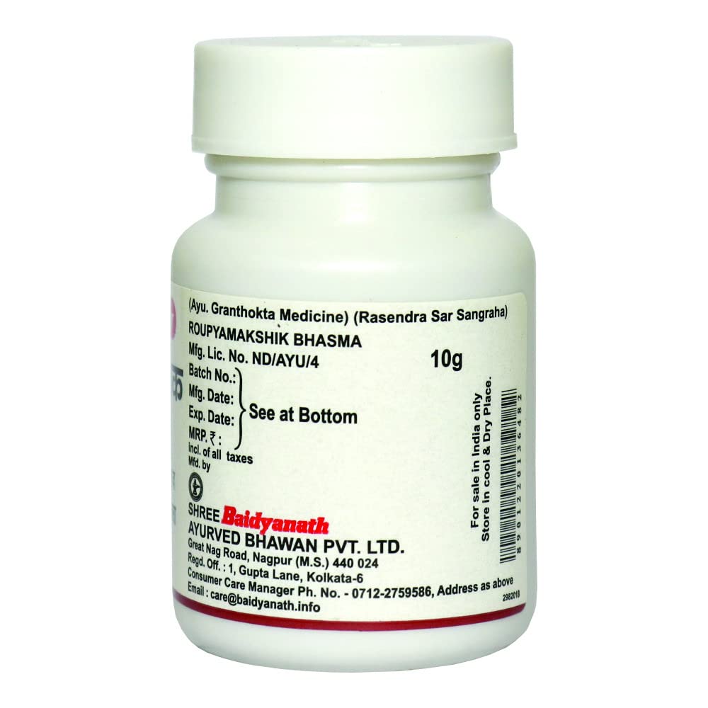 Baidyanath Roupyamakshik Bhasma-10 Gm (Pack Of 2). One of India;s most respected Companies Shree Baidyanath Ayurved Bhawan Pvt. Ltd. (Nagpur) popularly known as Baidyanath is the acknowledged leader of Ayurvedic know-how. Established in 1917 the Company has played a pioneering role in re-establishing ancient knowledge with modern research and manufacturing techniques. AYURVEDA is a 5000 year old Science of health care and herbal treatment. AYURVEDA is highly effective in common and complicated ailments assures long term relief and has no side effects. AYURVEDA is now backed by modern scientific research and technologies and provides its gentle healing touch to millions around the world.