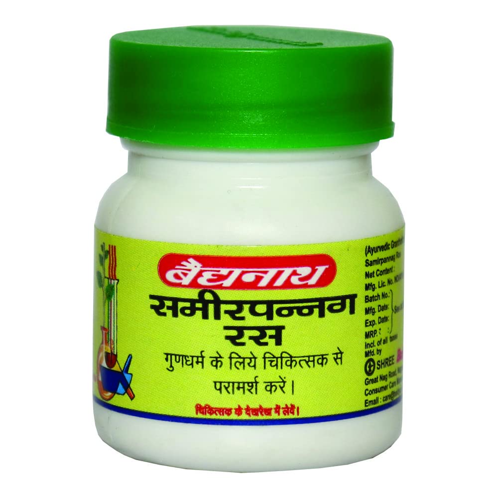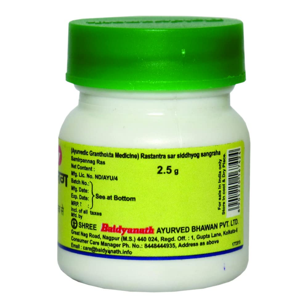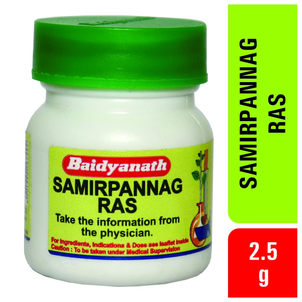 Baidyanath Samirpannag Ras-2.5 Gm (Pack Of 2). One of India;s most respected Companies Shree Baidyanath Ayurved Bhawan Pvt. Ltd. (Nagpur) popularly known as Baidyanath is the acknowledged leader of Ayurvedic know-how. Established in 1917 the Company has played a pioneering role in re-establishing ancient knowledge with modern research and manufacturing techniques. AYURVEDA is a 5000 year old Science of health care and herbal treatment. AYURVEDA is highly effective in common and complicated ailments assures long term relief and has no side effects. AYURVEDA is now backed by modern scientific research and technologies and provides its gentle healing touch to millions around the world.