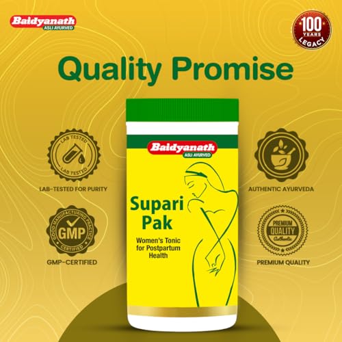 Baidyanath Supari Pak is a traditional Ayurvedic supplement for women's post-natal care. It helps support women's health and helps relieve headaches and backaches. It helps boost energy in women and supports uterus functioning. Mix 1-2 spoonfuls with equal quantities of water and consume it twice a day post meals or as directed by an Ayurvedic practitioner.