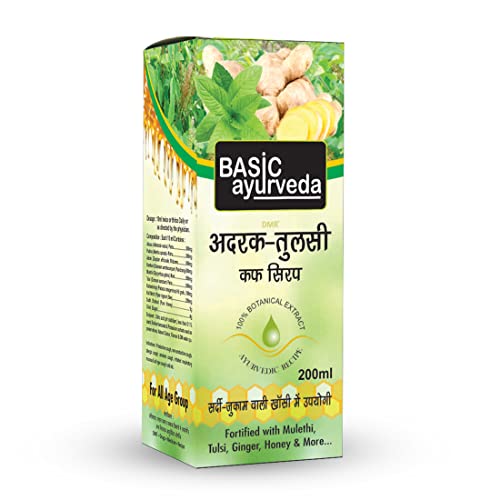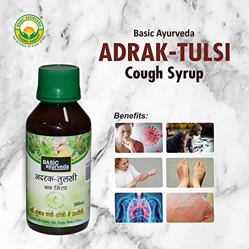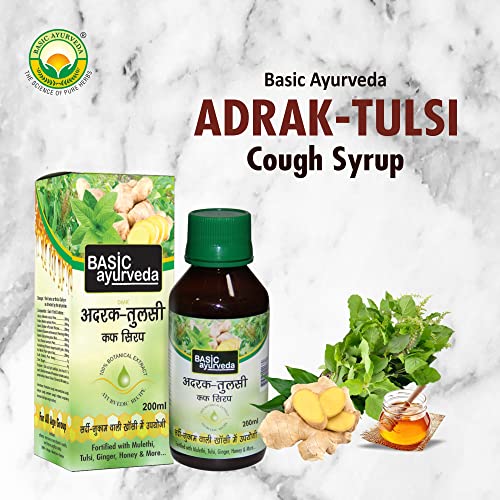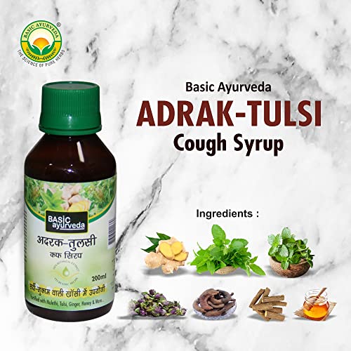 • Basic Ayurveda Adrak tulsi syrup is a herbal classical ayurvedic formulation accurately composed that is available in the form of liquid. And the combination of herbs Adusa Pudina Adrak Kantkari Mulethi Tulsi Kakrashringi Kali Mirch and Sudh Shahad (Honey