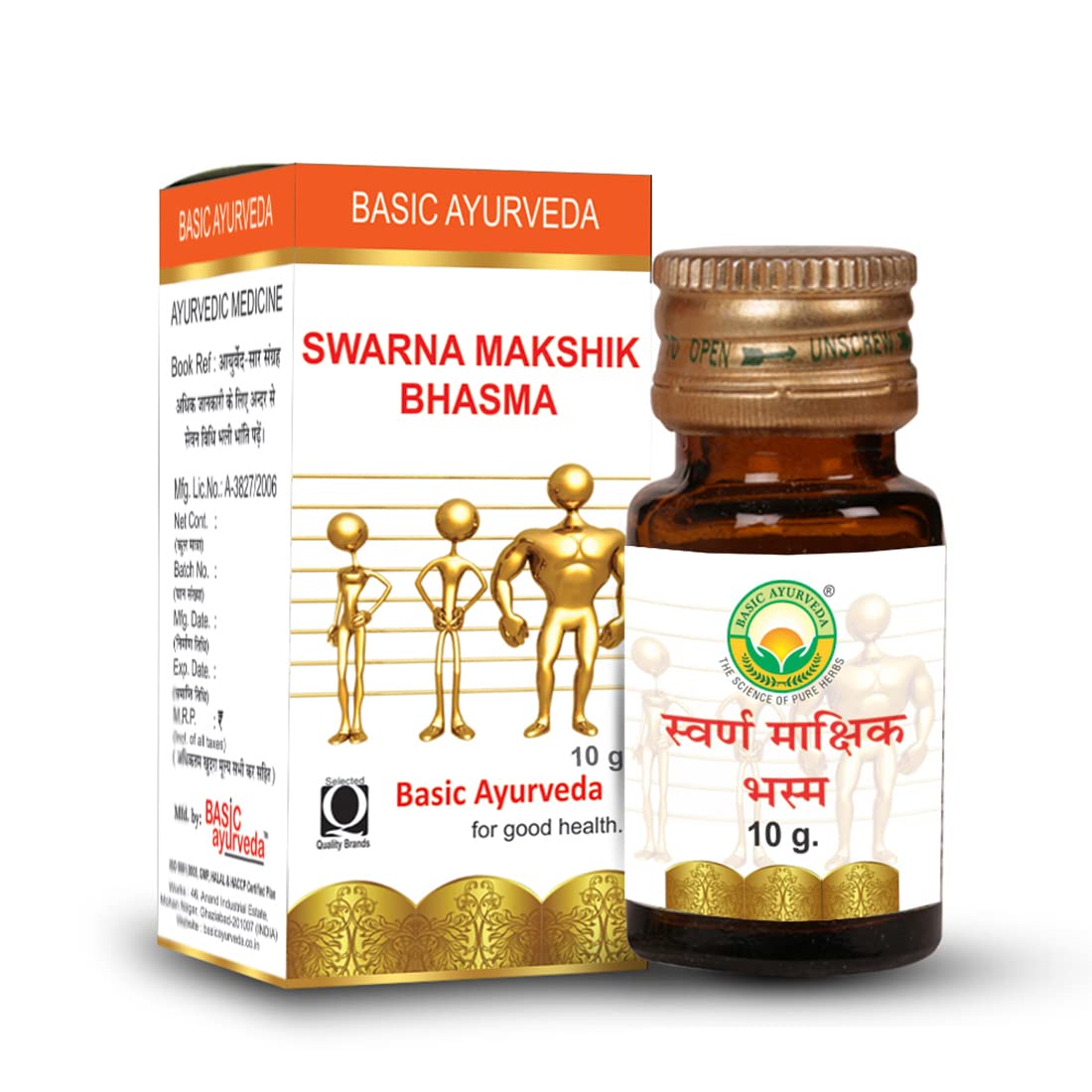 • Basic Ayurveda's Swarna Makshik Bhasma is an Ayurvedic formulation in the form of powder. It is used in blood sugar stomach health and skin health.