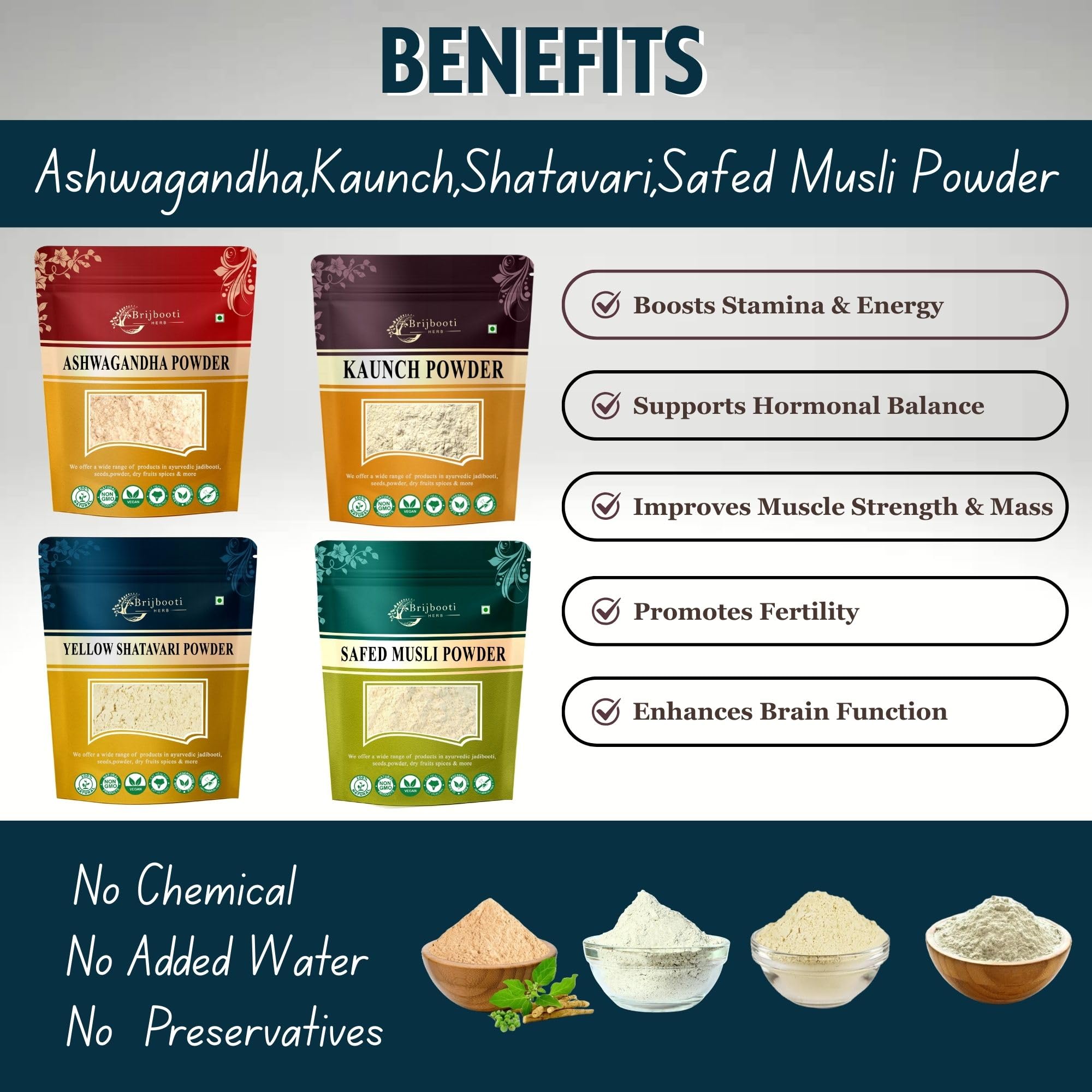 Birju Mahavir Combo Pack of Safed Musli - Ashwagandha - Kaunch - Shatavari Powder 200 gram Each Multi-colored Powder 800 gram
