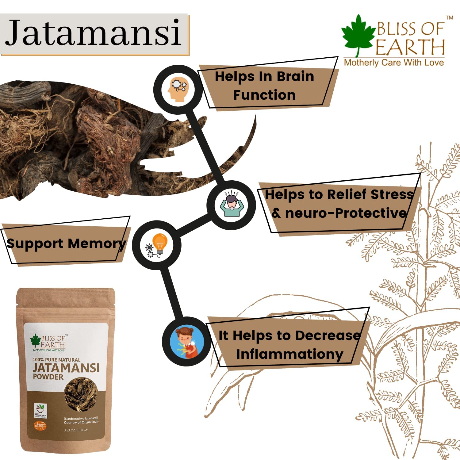 Bliss of Earth 100% Pure Natural Jatamansi Powder The ancient Ayurvedic herb that will raise your hair game by leaps and bounds Jatamansi deserves all the accolades that it has been receiving since times immemorial for its sterling hair care virtues. A calming herb by nature Jatamansi is regarded a rejuvenating tonic for your mind as well as mane. If you desire silky smooth thick and stunning long locks your quest for the âit' ingredient in your DIY hair potions should land you at Jatamansi. From battling dandruff to arresting excessive hair fall balding thinning flaky scalp to accelerating the rate of hair growth Jatamansi does it all. Check check and double check! At Bliss of Earth we are confident of providing nothing short of the most authentic Jatamansi powder to you for all your DIY endeavours Henna Leaf Powder is Natural & organic its free from harmful chemicals preservatives emulsifier and synthetic colorants