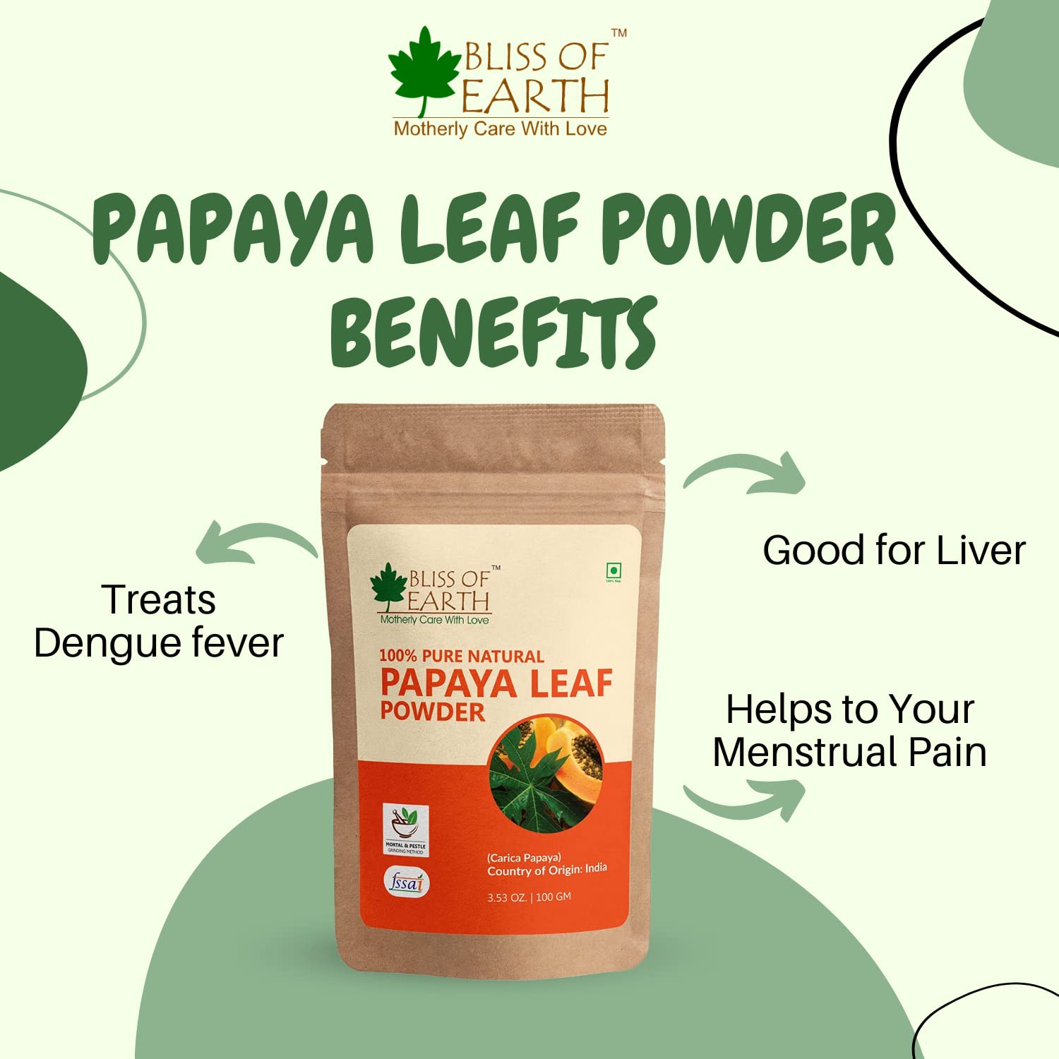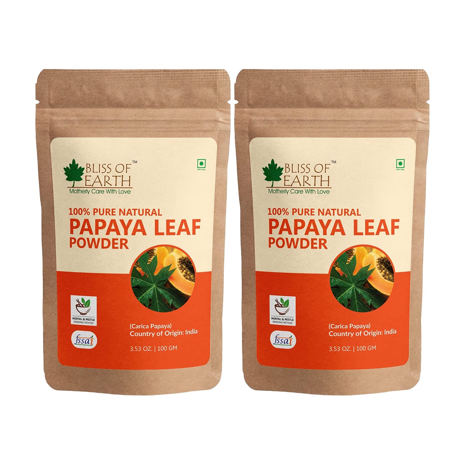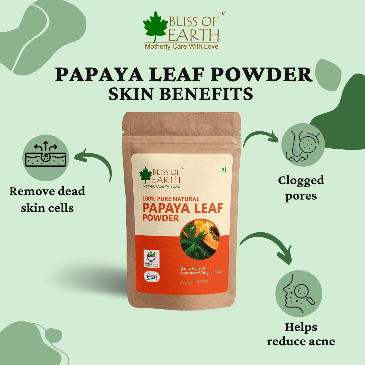 Tender succulent and refreshing the burst of sweetness that our taste buds relish in as our teeth and tongue slice juice and tear away its juicy pulp Papayas are as amazing for your health as they are for your skin.With its soft butter-like texture papayas are a rich source of anti-oxidants and nutrients thus making them an instant favourite of anyone and everyone who wants supple satin-smooth even and radiant skin.only does it help in scraping away layers of dead skin cells gently but also hydrates your skin's thirst for moisture. If that's not enough its anti-oxidant content helps slow down signs of premature ageing wrinkling sun burn and a host of other skin woes.Nothing but the finest quality of papaya powder is here at your disposal with Bliss of Earth's Papaya powder that is as salubrious for your skin as a smoothie made out of it is for your overall health! Indulge in the goodness of this wondrous natural elixir.