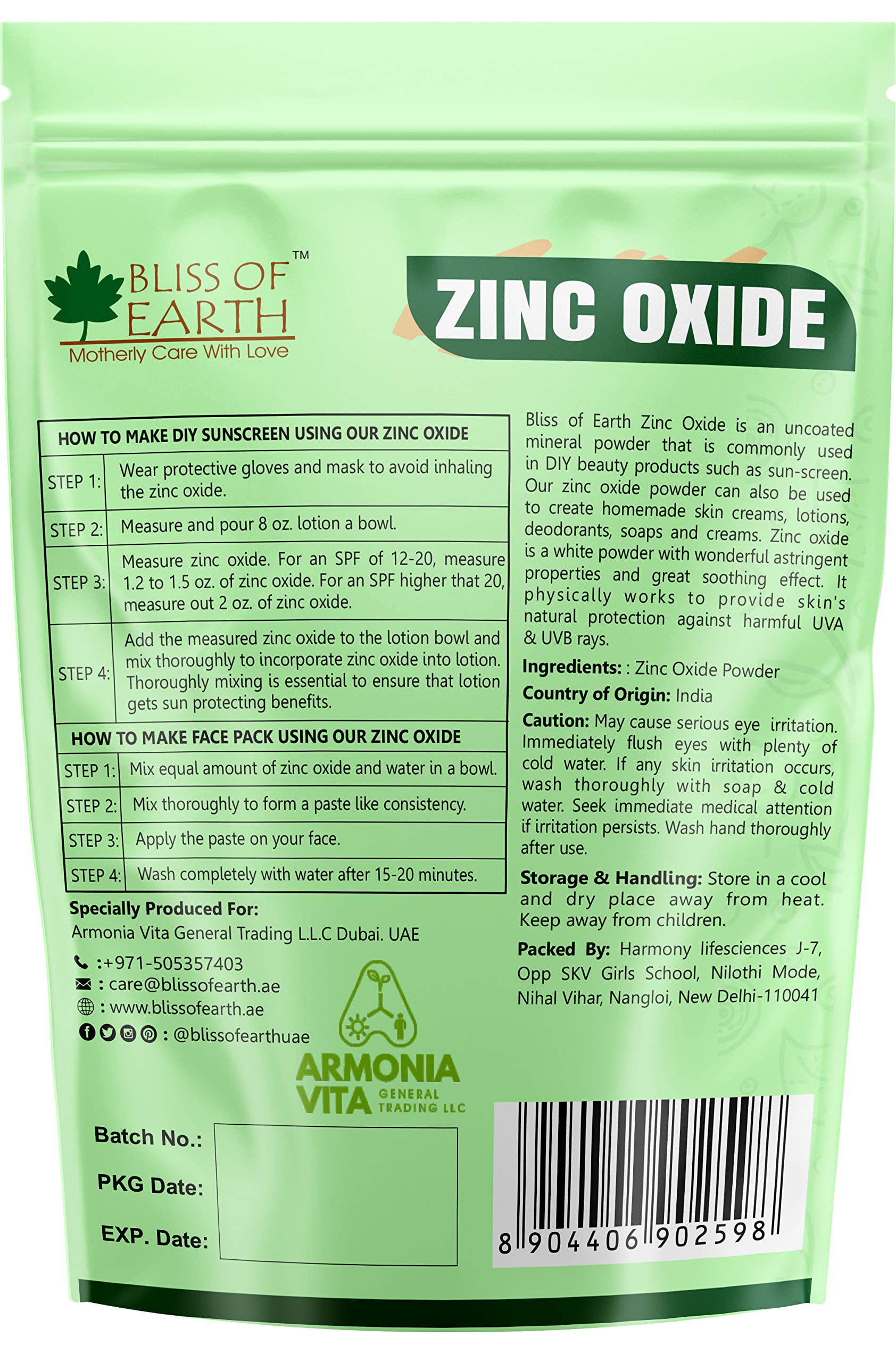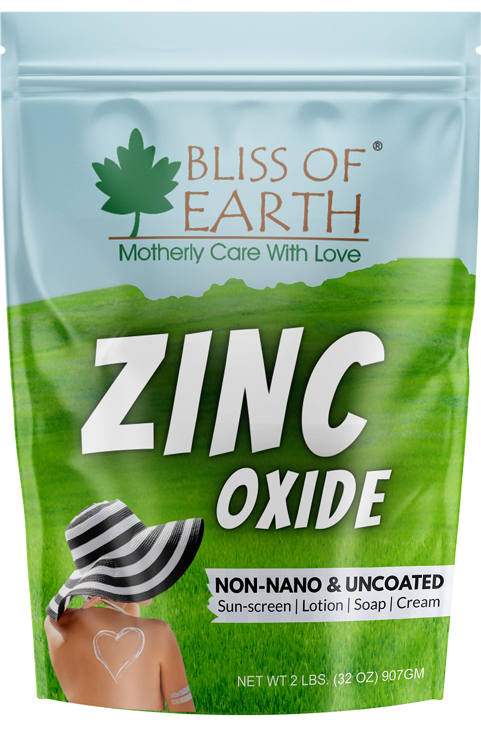 Bliss of Earth Zinc Oxide is an uncoated mineral powder that is commonly used in DIY products such as sun-screen. Our zinc oxide powder can also be used to create homemade skin creams lotions deodorants soaps and creams. Zinc oxide is a white powder with wonderful astringent properties and great soothing effect. It physically works to provide skin's natural protection against harmful UVA & UVB rays.