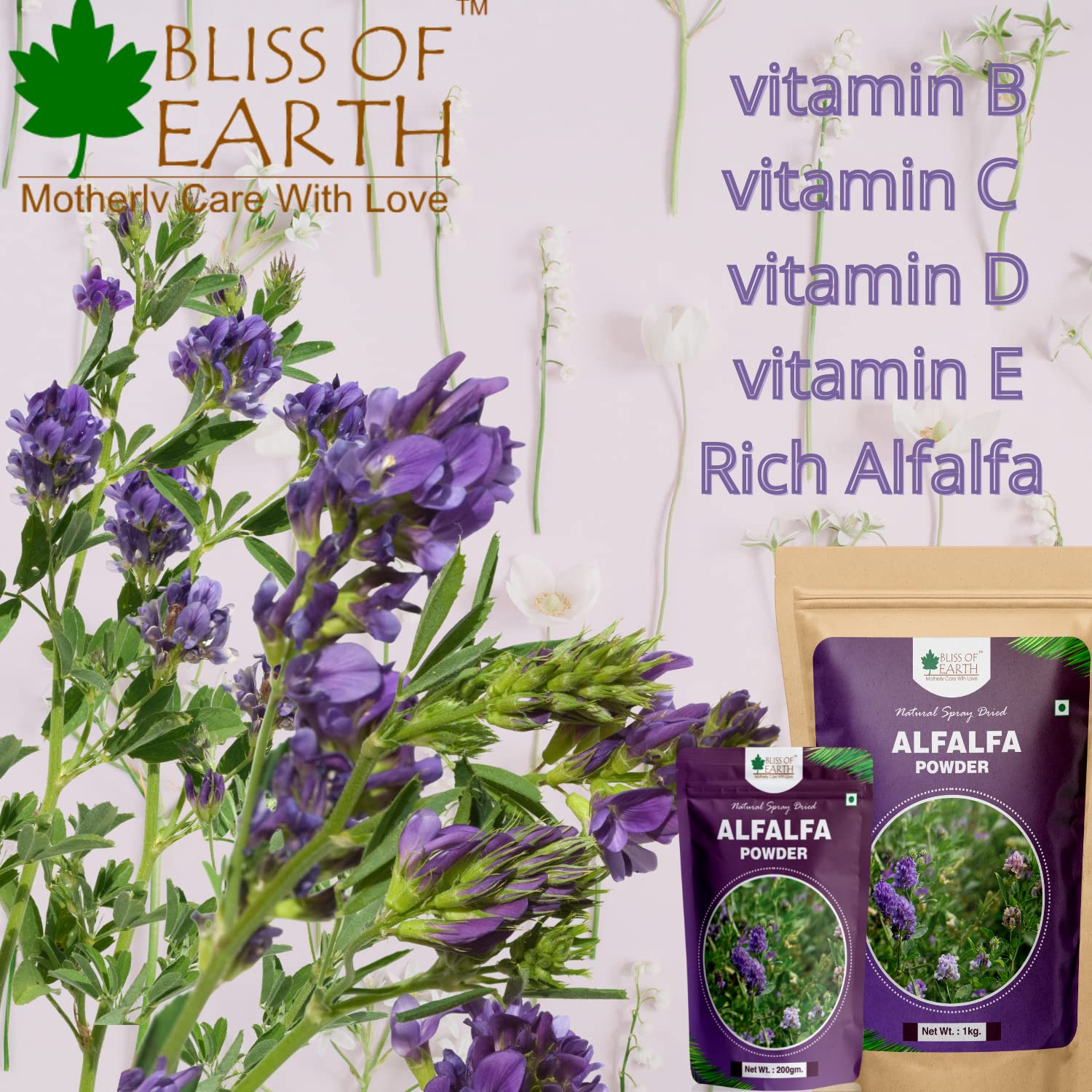 Bliss of Earth Alfalfa powder is derived from the nutrient rich leaves of alfalfa by spray drying method. it is known to be on of the most nutrient rich plants in the world. it contains essential vitamins including the spectrum of b-vitaminsADE&K.Alfalfa powder is a rich source of iron biotin folic acid calcium magnesium potassium and phosphorus. people form all over the world use alfalfa to get glowing skin.