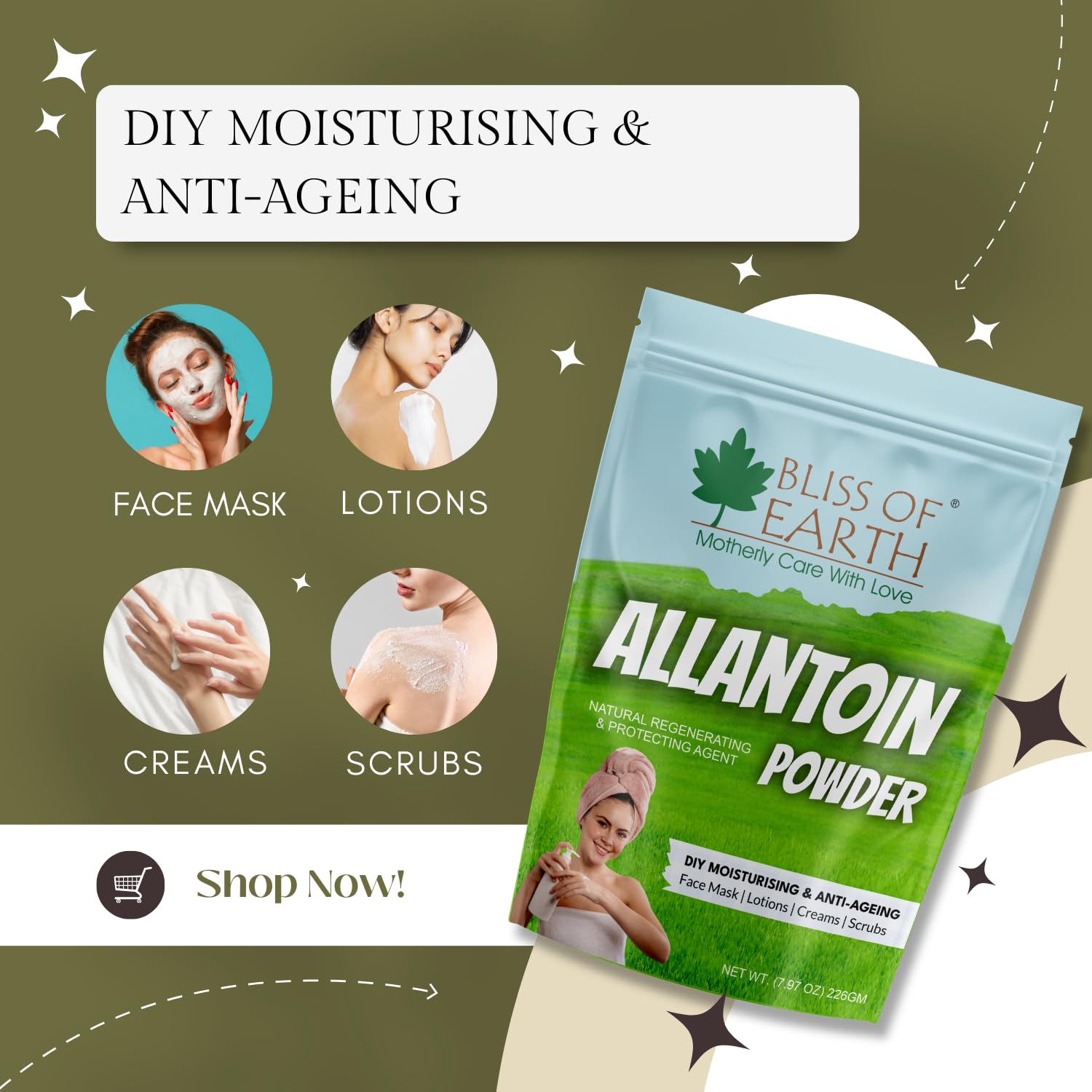 Skin Savior Allantoin PowderWant to achieve smooth and healthy skin effortlessly? Look no further! Bliss of Earth's Allantoin powder promotes skin cell regeneration soothes irritation and locks in moisture leaving your skin soft and supple. Its natural healing properties make it perfect for treating dry rough or damaged skin.Pure and Potent FormulaBliss of Earth's Allantoin powder is 100% natural and free from additives ensuring a safe and effective solution for various skin concerns. By promoting healthy tissue growth and protecting the skin from environmental stressors this powder lets you enjoy glowing revitalized skin with ease. Try it now and experience the skin-transforming power!