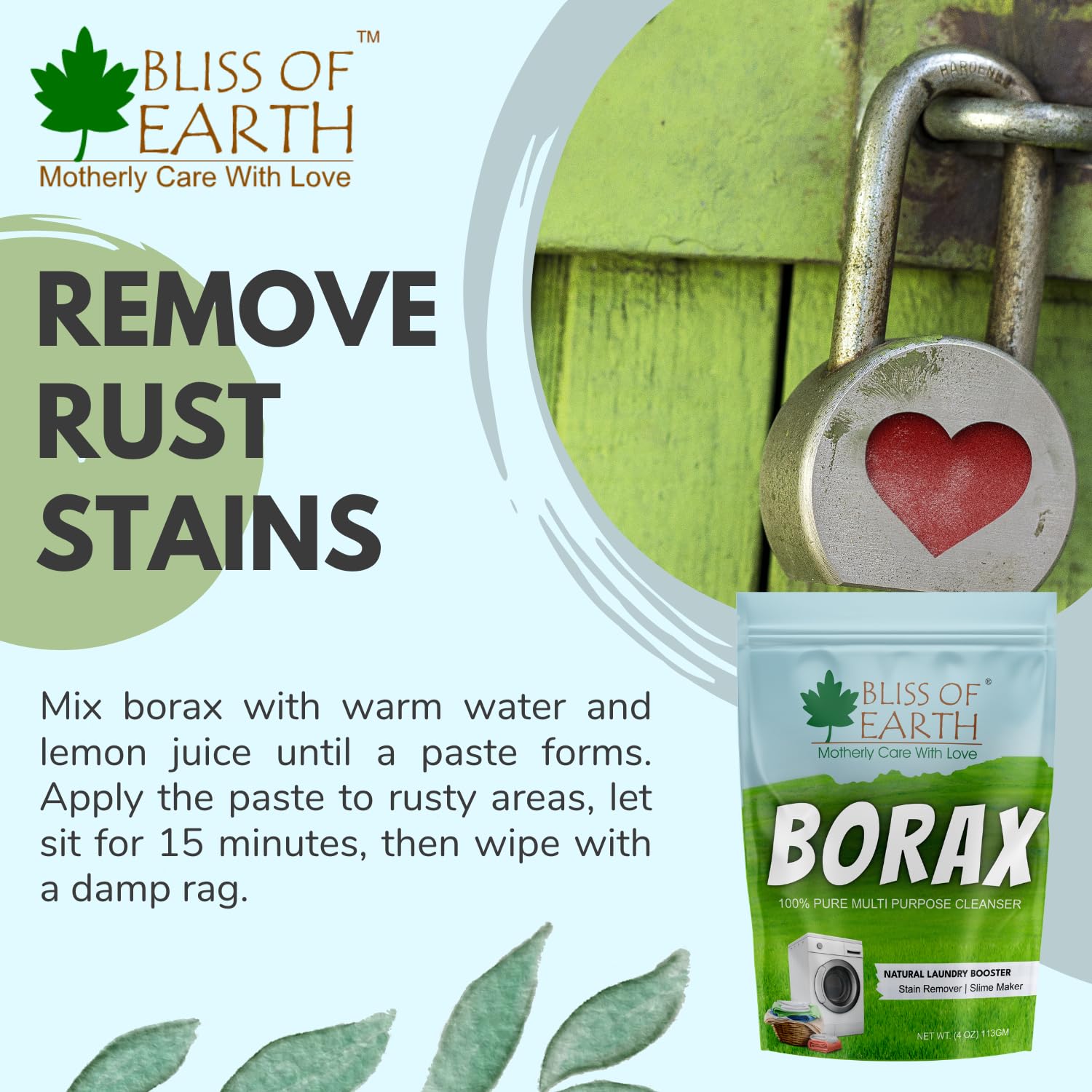 REMOVE RUST STAINS: Mix borax powder for stain removal with warm water and lemon juice until a paste forms. Apply the paste to rusty areas let sit for 15 minutes then wipe with a damp rag.