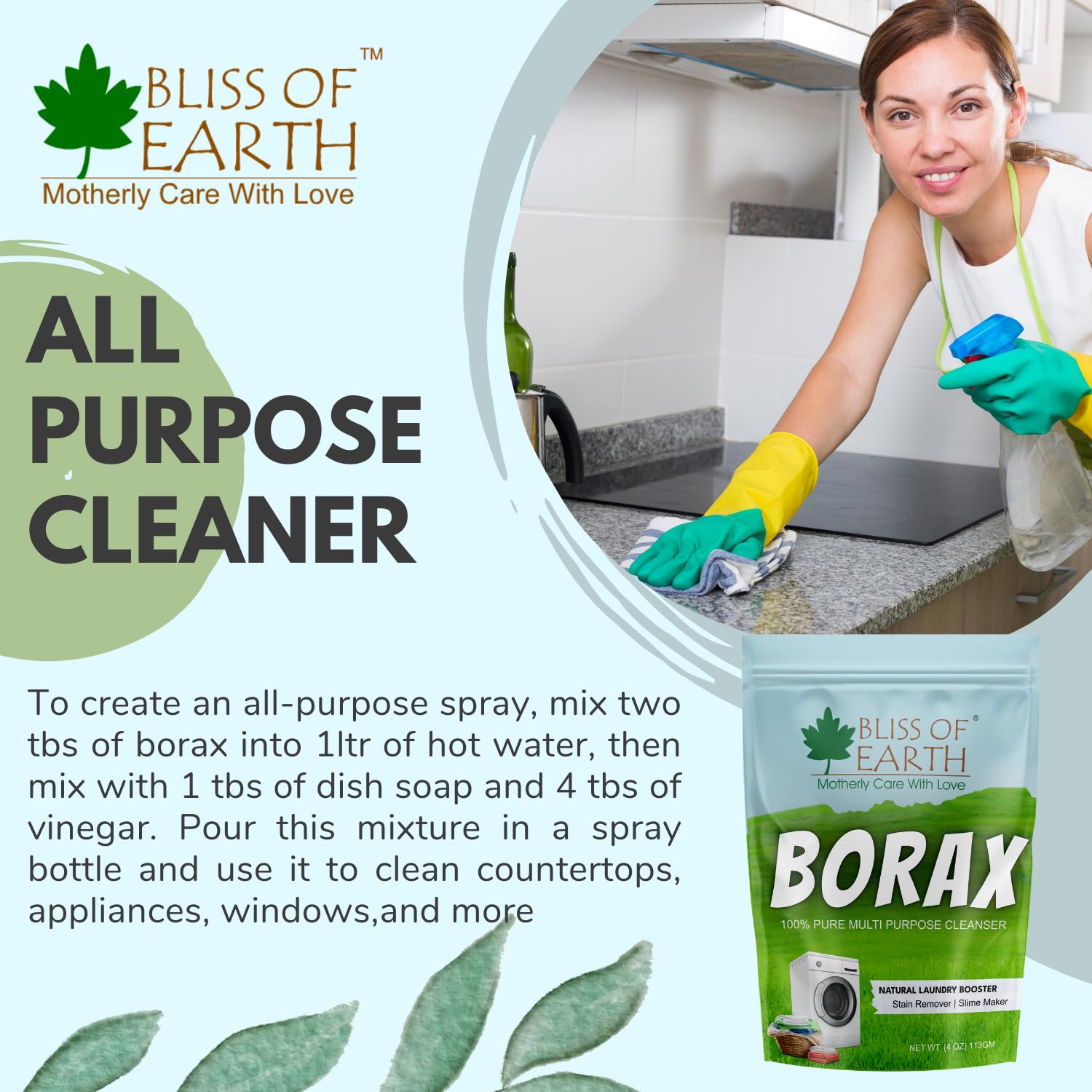 ALL PURPOSE CLEANING SPRAY: To create an all-purpose spray mix two tbs of borax powder for cleaning into 1ltr of hot water then mix with 1 tbs of dish soap and 4 tbs of vinegar Pour this mixture in a spray bottle and use it to clean counter tops appliance