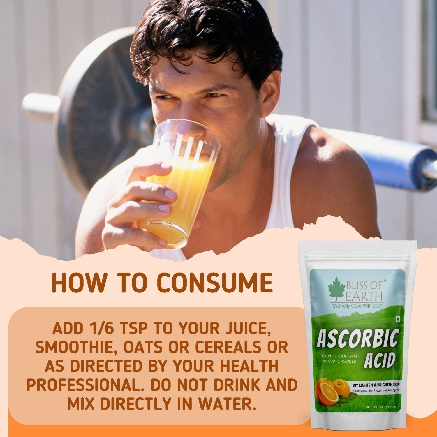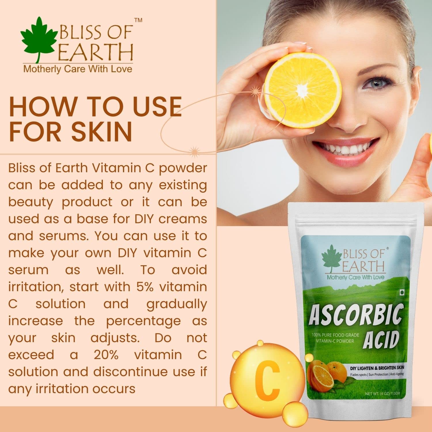 Bliss of Earth Ascorbic acid or commonly known as Vitamin C is important to the body's diet. it helps fight off diseases infections and overall healing capabilities. Vitamins-C takes a step further in you body by processing carbohydrates proteins fats and assisting in building blood vessels collagen muscle and cartilage. Vitamin C is particularly important for maintaining healthy-looking skin as well. your skin cells use this vitamin to protect from stress caused by pollution smoking and UV rays. your skin also needs Vitamin C to create collagen it is an effective antioxidant that brighten the skin tone and reduces the appearance of signs of ageing.