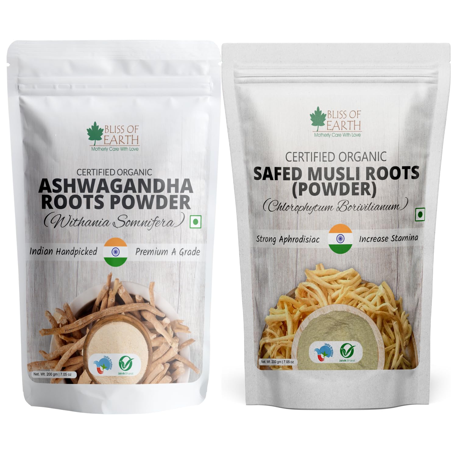 Bliss of Earth Ashwagandha Powder Withania Somnifera & Safed Musli Powder Orgnaic Great for Immunity & Stamina 200gm Each