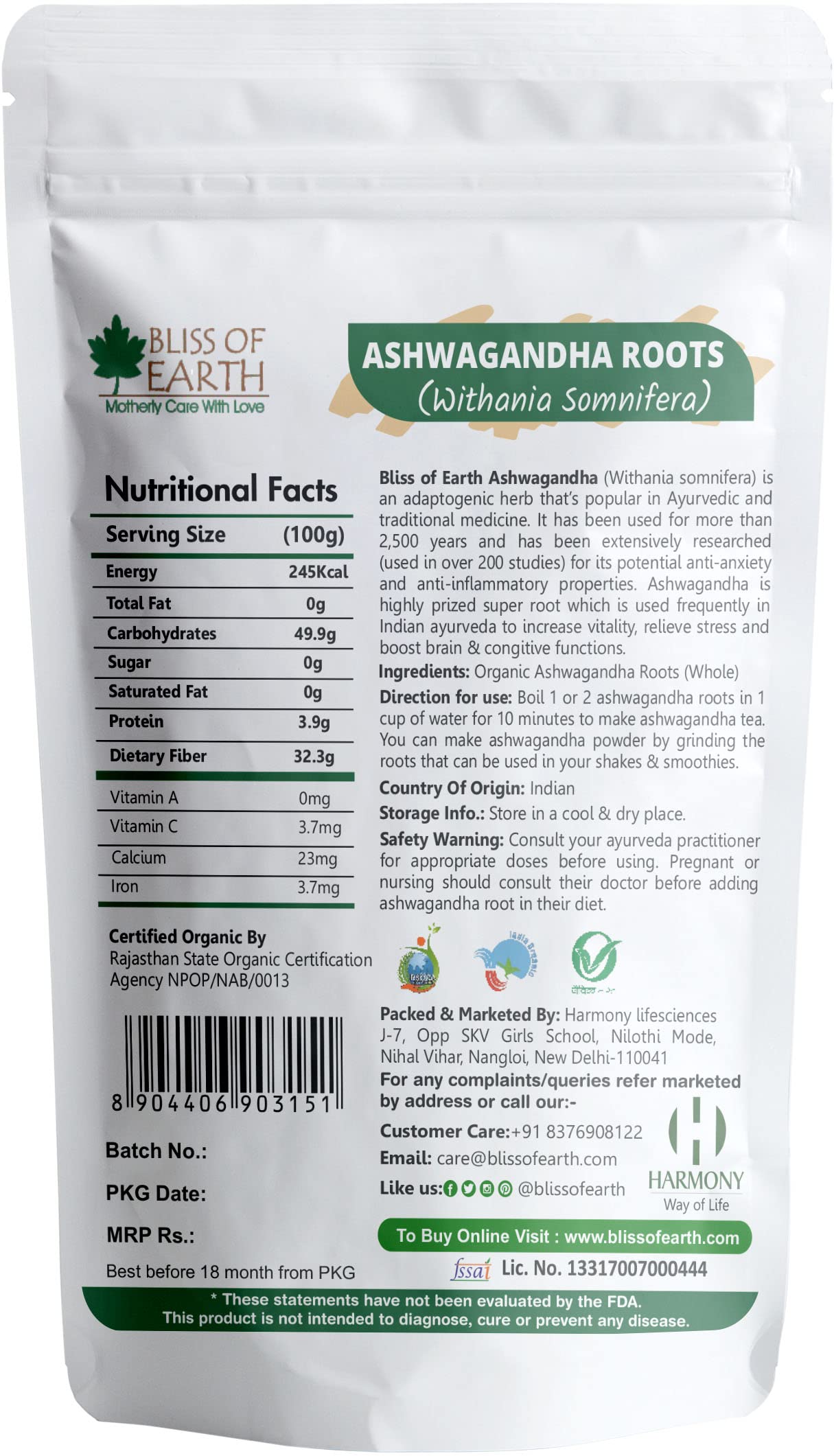 Bliss of Earth Ashwagandha (WIthania Somnifera) is an apoptogenic herb that's popular in Ayurvedic and traditional medicine. It has been extensively researched (used in over 200 studies) for its potential anti-anxiety and anti-inflammatory properties. Ashwagandha is highly prized super root which is used frequently in Indian Ayurveda to increase vitality relieve stress and boost brain & cognitive functions