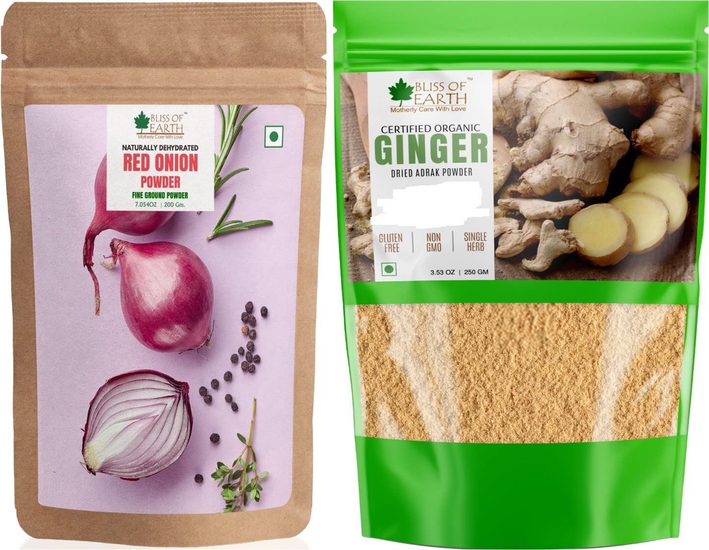 Bliss of Earth Natural Red Onion Powder is dehydrated ground onion that is most important culinary ingredients in every kitchen. Its characteristics strong flavour when raw makes it great addition on salad. Its sweet flavour when cooked is a key element for meats poultry seafood and all kind of side dishes. Bliss of Earth ginger powder is certified organic versatile herb known for centuries for its health benafits. We dehydrate the ginger at low tempratures so it ratain all the nutrients and amazing flavor. There are 115 chemical compounds found in ginger root making it a super antioxidant and anti-inflammatory agent. Ginger has been proven to aid in boosting immunity digestive support and cough & cold. We love how fresh ginger makes us feel. Its natural flavor makes a perfect addition to your favourite juice smoothie or tea.