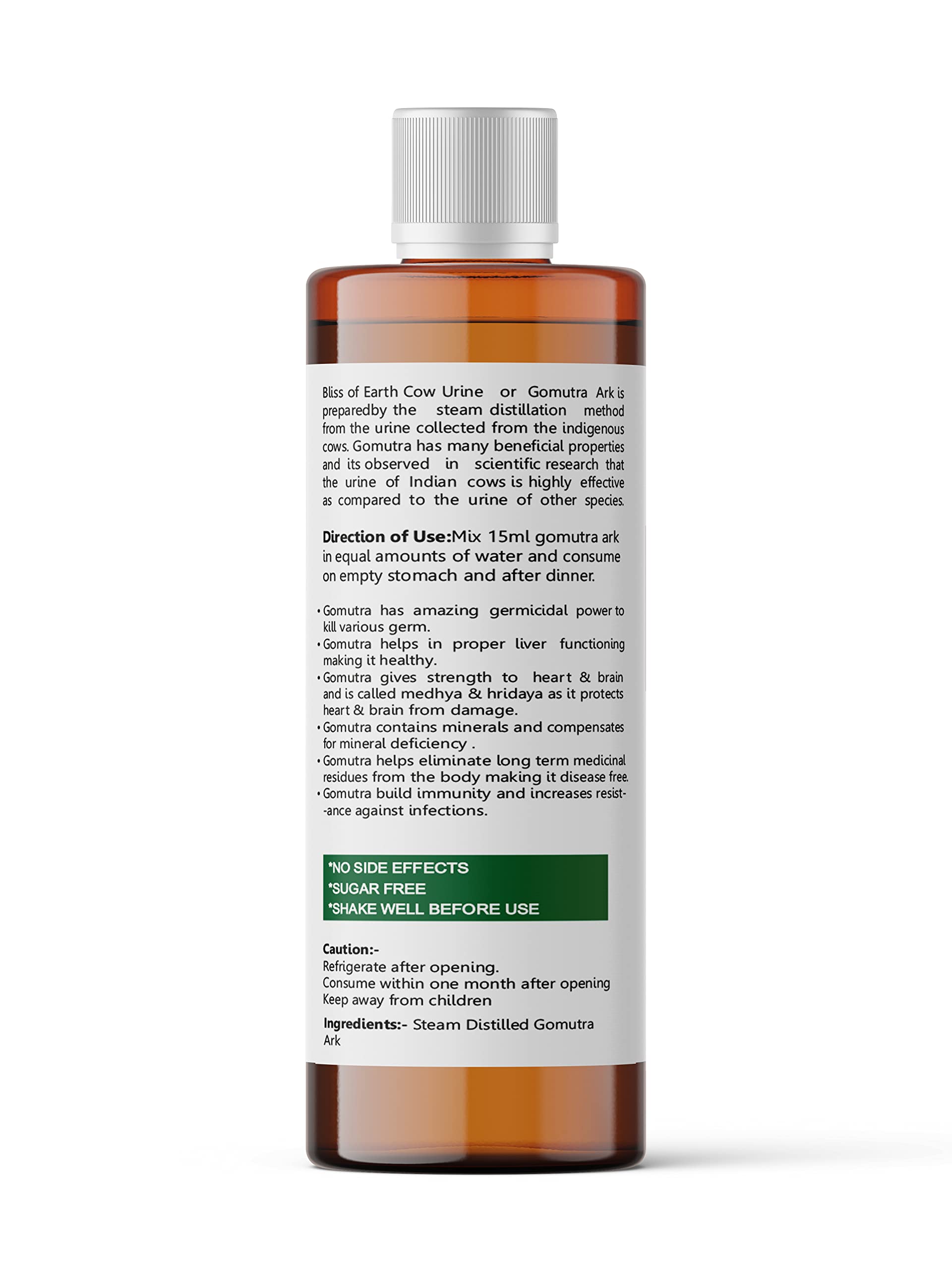 Bliss of Earth Cow Urine or Gomutra Ark is prepared by the steam distillation method from the urine collected from the indigenous cows. Gomutra has many beneficial properties and its observed in scientific research that the urine of indian cows is highly effective as compared to the urine of other species.