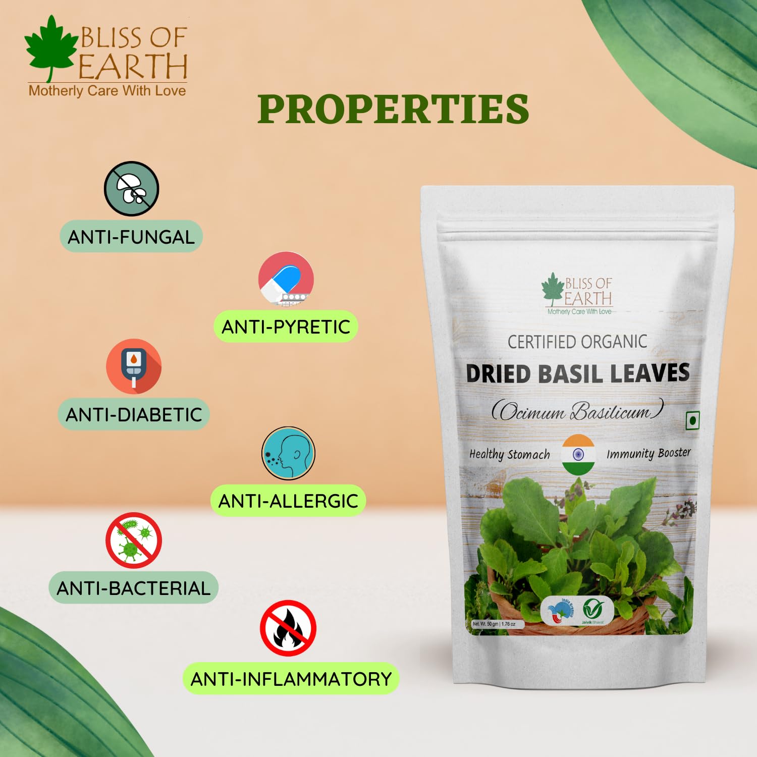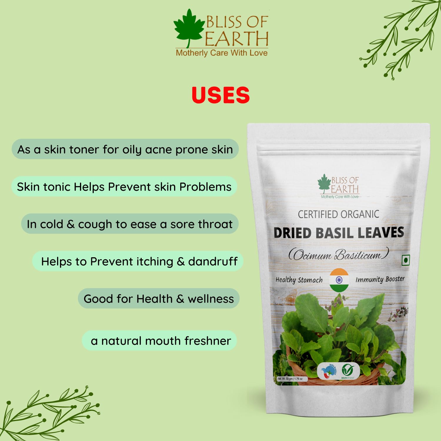 Bliss of Earth Certified Organic Dried Basil Leaves is a Sacred and remarkable herb loaded with numerous health benefits and also known as "Queen of Herbs". It is a rich source of Vitamin A & K Iron Manganese Calcium and also works as an antioxidants.