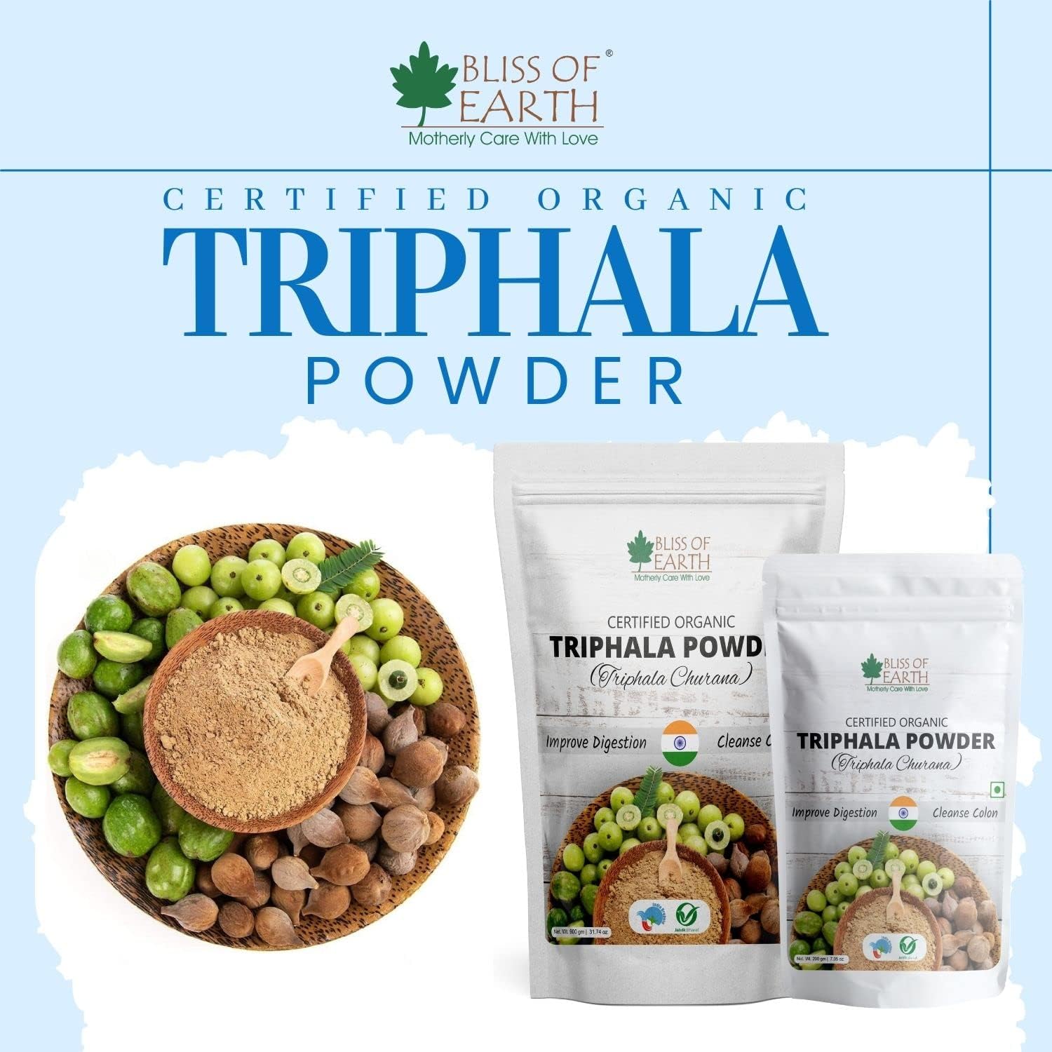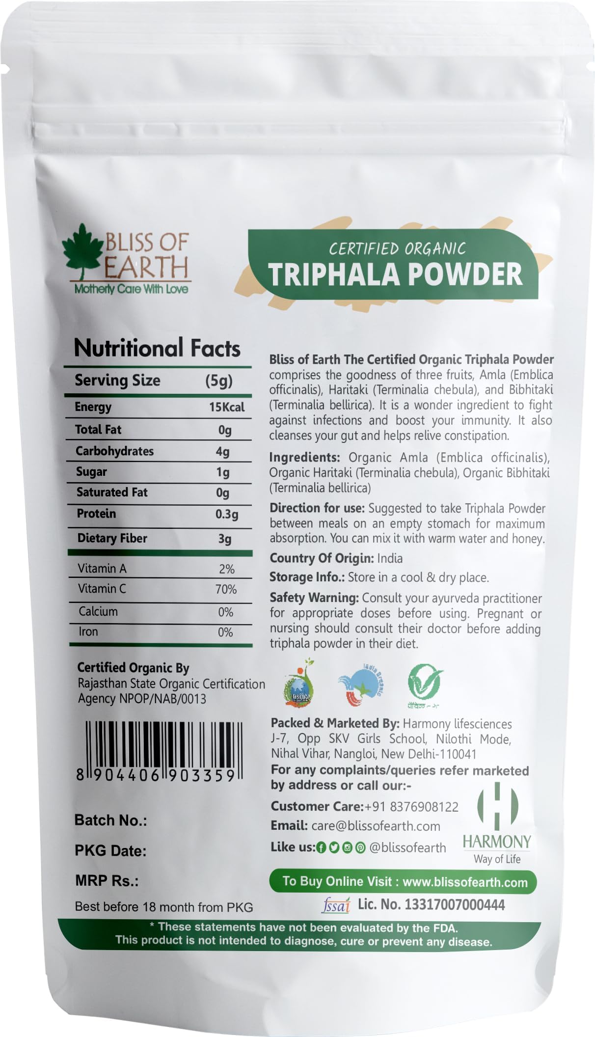 Bliss of Earth The Certified Organic Triphala Powder comprises the goodness of the three fruits Amla (Emblica officinalist) Haritaki (terminalia chebula) and Bibhitaki (terminalia bellirica). It is a wonder ingredient to help boost your immunity. It also help cleanses your gut and helps relive constipations.