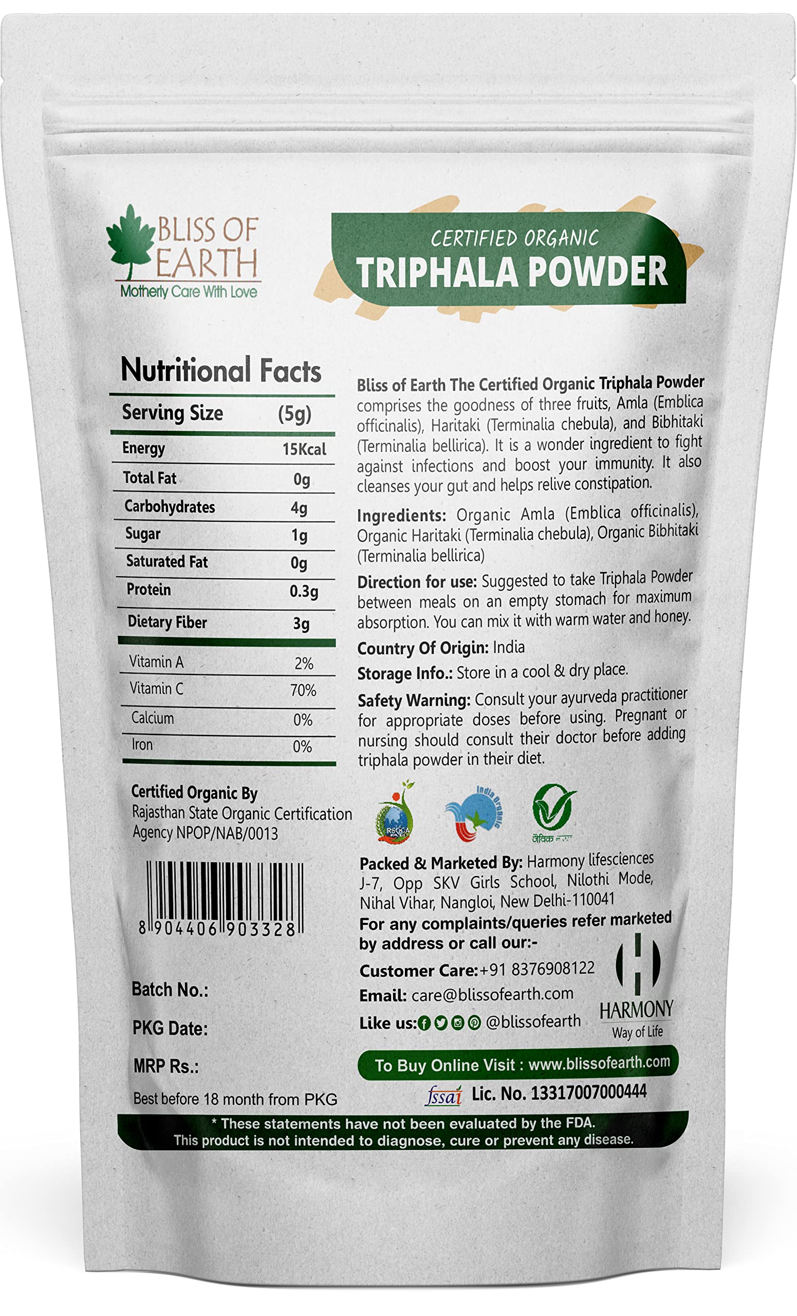 Bliss of Earth The Certified Organic Triphala Powder comprises the goodness of the three fruits Amla (Emblica officinalist) Haritaki (terminalia chebula) and Bibhitaki (terminalia bellirica). It is a wonder ingredient to fight against infections and boost your immunity. It also cleanses your gut and helps relive constipations.