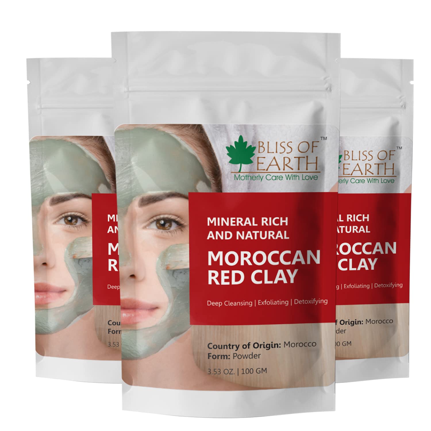Bliss of Earth Original Moroccan Red Clay Powder | 3x100GM | Natural Facial Mask & Skin Care Treatment | Anti-Ageing | Heals Dry & Oily Skin | Detoxifying & Rejuvenating |