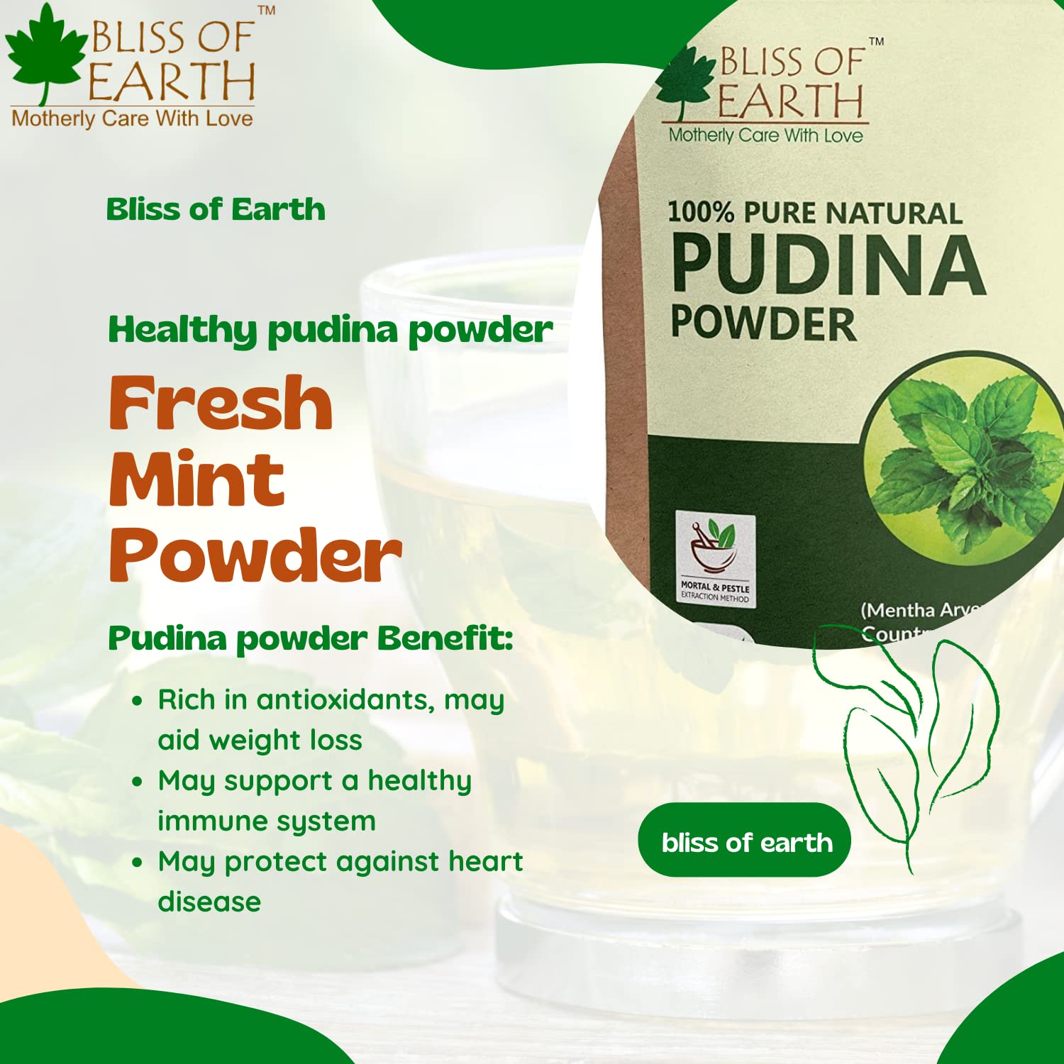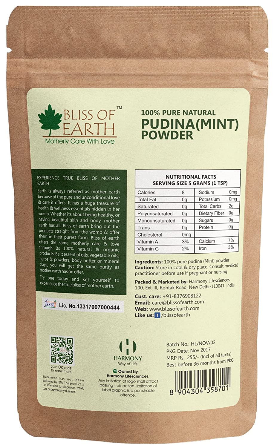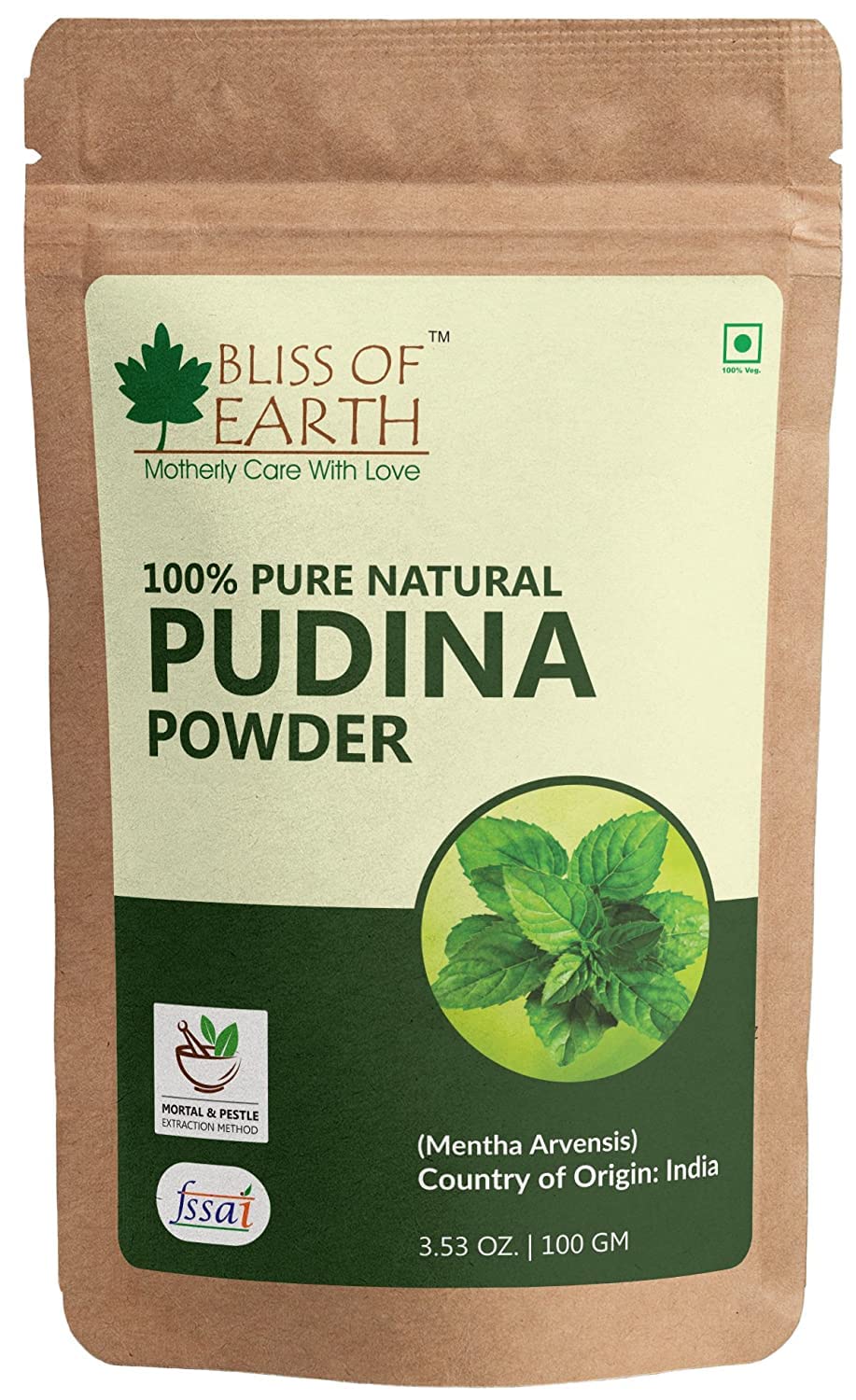 Cooling calming and energising mint aka Pudina is the cornerstone of most Desi beauty regimens all thanks to the instant burst of coolness it exudes to our skin in sweltering summers. Whether dashed generously on cuisines or applied topically discounting the beauty benefits of this humble beauty ingredient is a sin mark those words in capital.Laden with salicylic acid and antioxidants in galore if you incorporate Mint (Pudina) in your beauty routine stay assured acne pimples premature signs of ageing dullness and unwarranted inexplicable breakouts will be taken care of. After all your skin's shield is raring to go berserk on all these woes!If that didn't get you excited to jump on your bed in sheer euphoria here's more Mint helps impart a clear blemish-free spot-free flawless skin tone. Can you name anyone who does not desire it? You surely know what to add to your beauty closet next now don't you? Settle for nothing less than the best Bliss of Earth's Pudina (Mind) Powder for it will be your skin's best friend in the twinkling of an eye.