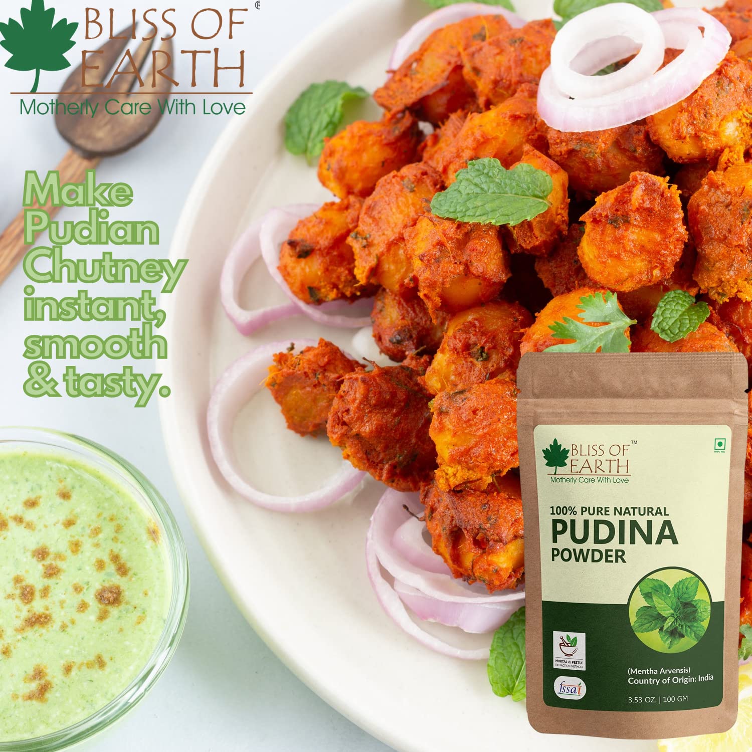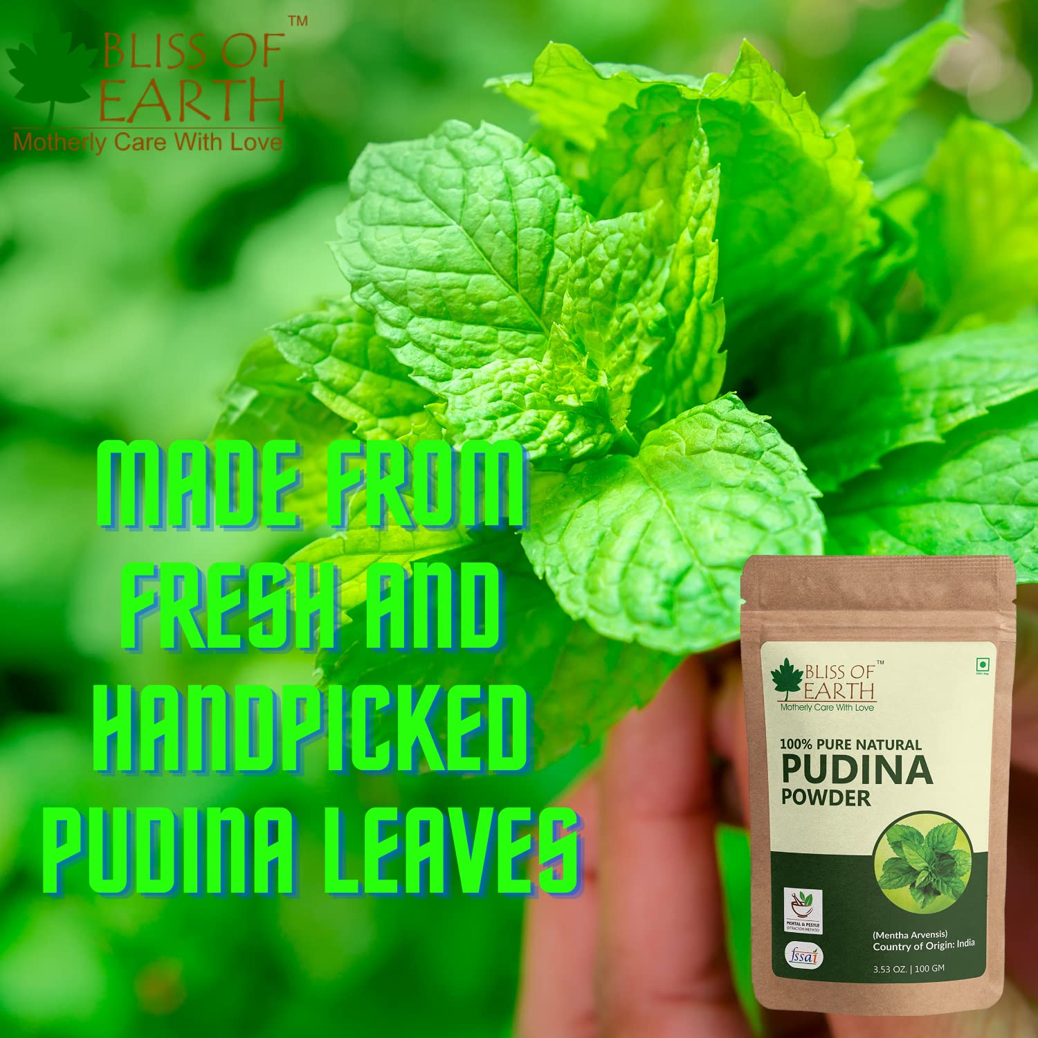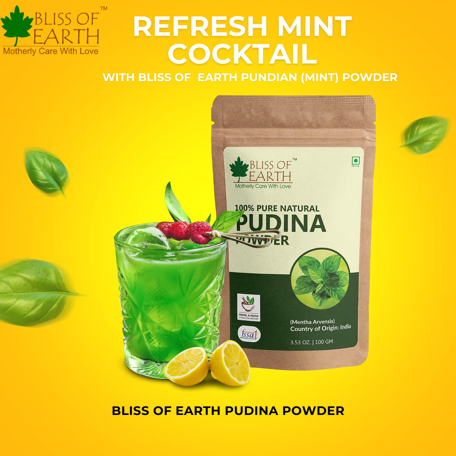Cooling calming and energising mint aka Pudina is the cornerstone of most Desi beauty regimens all thanks to the instant burst of coolness it exudes to our skin in sweltering summers. Whether dashed generously on cuisines or applied topically discounting the beauty benefits of this humble beauty ingredient is a sin mark those words in capital.Laden with salicylic acid and antioxidants in galore if you incorporate Mint (Pudina) in your beauty routine stay assured acne pimples premature signs of ageing dullness and unwarranted inexplicable breakouts will be taken care of. After all your skin's shield is raring to go berserk on all these woes!If that didn't get you excited to jump on your bed in sheer euphoria here's more Mint helps impart a clear blemish-free spot-free flawless skin tone. Can you name anyone who does not desire it? You surely know what to add to your beauty closet next now don't you? Settle for nothing less than the best Bliss of Earth's Pudina (Mind) Powder for it will be your skin's best friend in the twinkling of an eye.